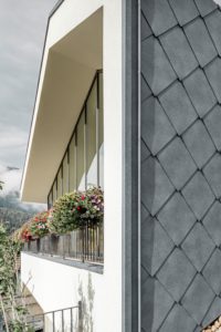 Prefa | Scaglie 44 è un rivestimento in alluminio pre-verniciato per facciate e tetti | Valle di Livo (Tn), particolare dell’edificio.