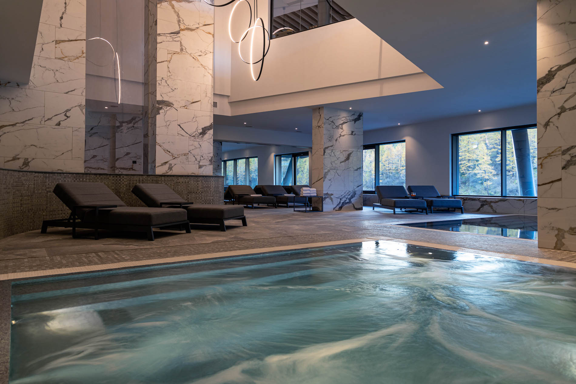 Lo spazio wellness continua il fil-rouge del marmo come segnale di lusso integrandolo nella sauna con il legno: «L’idea è quello del gioiello – spiega l’architetto Bettiol – ovvero di impreziosire l’oggetto che poteva essere rustico con materiali lussuosi e di pregio. Questo percorso lo si ritrova nello spazio piscina dove un gioco di specchi e la doppia altezza dell’ambiente che si compenetra nel ristorante creano giochi di luce con la sensazione che lo spazio si perda a vista d’occhio».