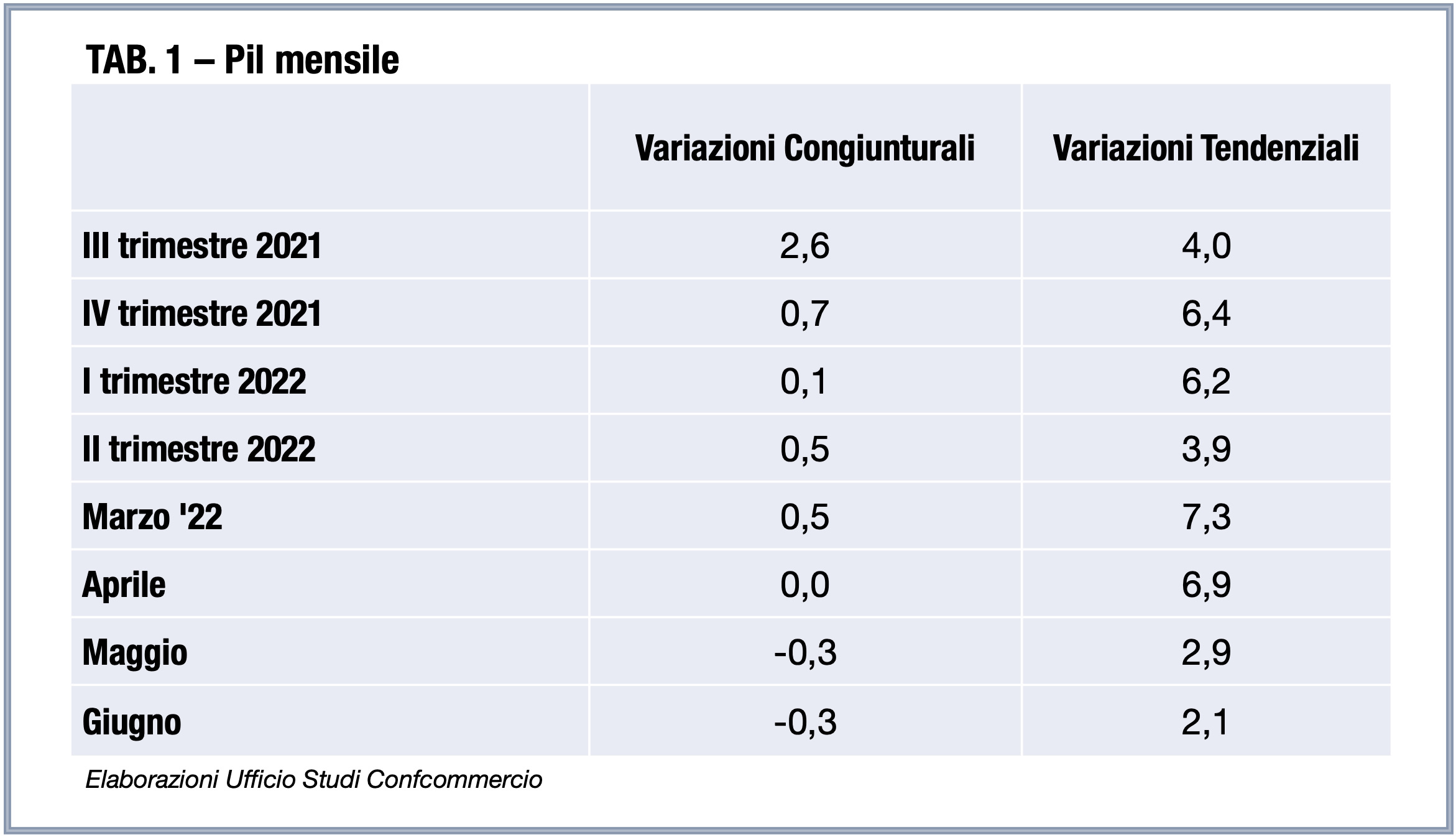 Secondo le nostre stime, il PIL dovrebbe registrare nel mese in corso una riduzione dello 0,3% su maggio. Nel confronto annuo la variazione si attesterebbe al 2,1% (tab. 1). Nel complesso del secondo trimestre dell’anno la crescita dovrebbe attestarsi allo 0,5% congiunturale, dato favorito dalla positiva eredità lasciata da febbraio e marzo, e al 3,9% rispetto al secondo trimestre del 2021.