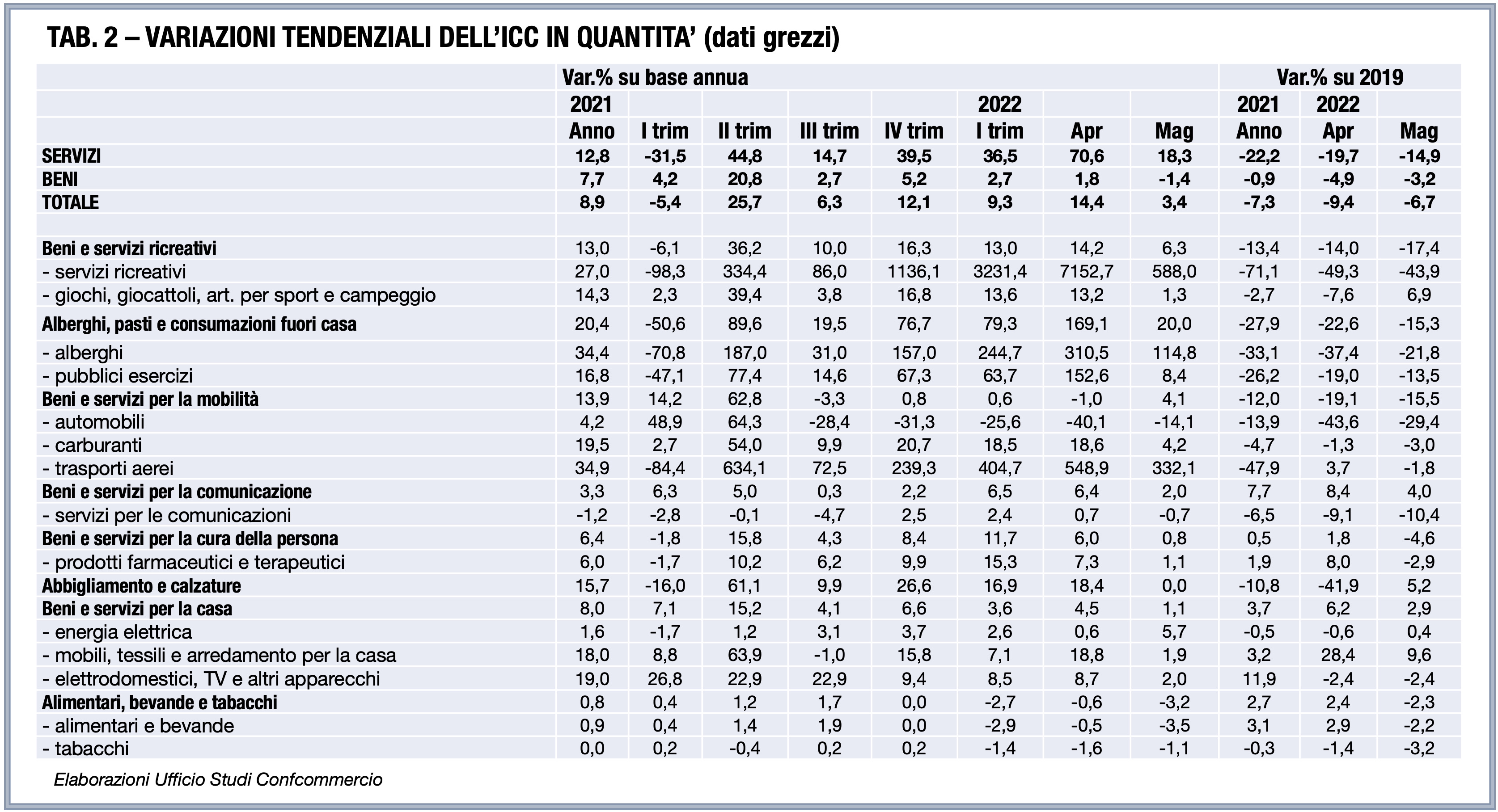 A maggio 2022 l’Indicatore dei Consumi Confcommercio (Icc) segnala un incremento, su base annua, del 3,4%, in netto ridimensionamento rispetto alla variazione di aprile (tab. 2). Il dato comincia a riflettere gli effetti di un confronto con mesi in cui le condizioni di operatività delle imprese sono diventate via via più favorevoli.