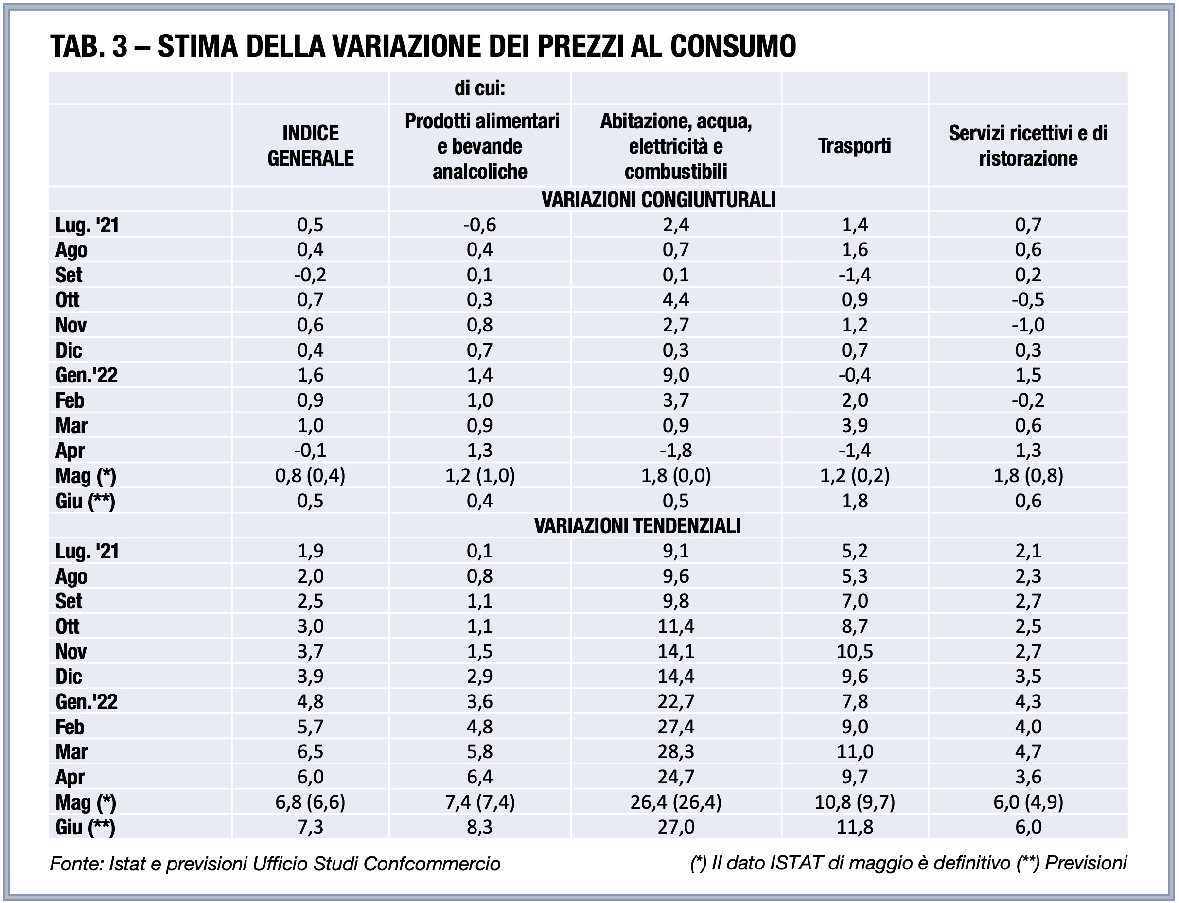 Tensioni inflazionistiche che non accennano ad attenuarsi. Sulla base delle nostre stime, a giugno si dovrebbe registrare, rispetto a maggio, un incremento dei prezzi al consumo dello 0,5% con una variazione del 7,3% su base annua.