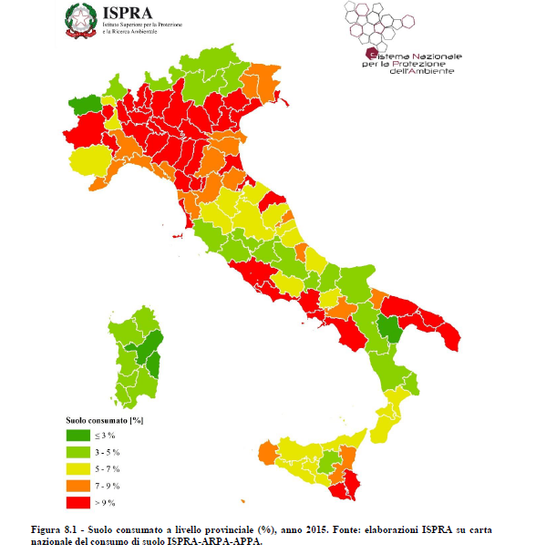 Zone di pericolosità. L’Italia perde ancora terreno e dal 2012 al 2015 il territorio sigillato è aumentato dello 0,7%, invadendo fiumi e laghi (+0,5%), coste (+0,3%) ed aree protette (+0,3%), avanzando anche in zone a pericolosità sismica (+0,8%), da frana (+0,3%) e idraulica (+0,6%).