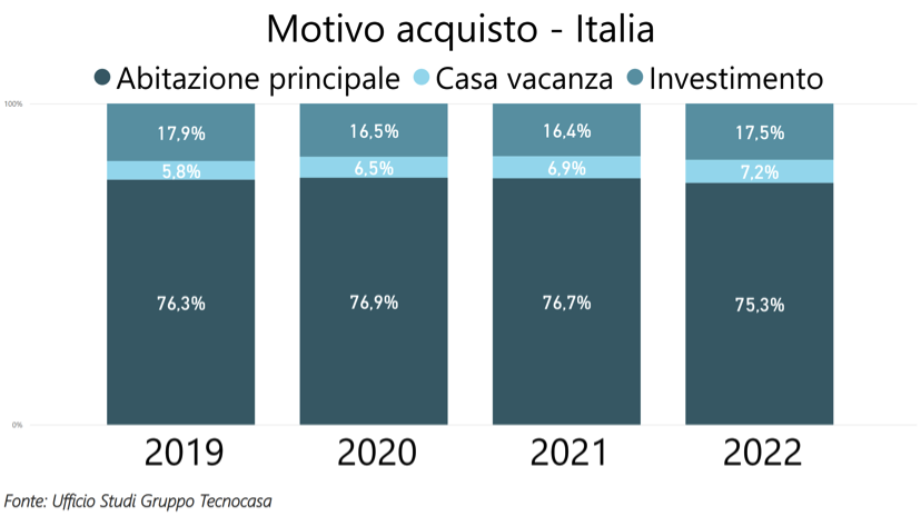 I dati riferiti alle compravendite di questa tipologia immobiliare mettono in luce che, nel 2022, la percentuale di chi acquista la casa vacanza si attesta intorno al 7,2%, in aumento rispetto al 6,9%, che si era registrato un anno fa