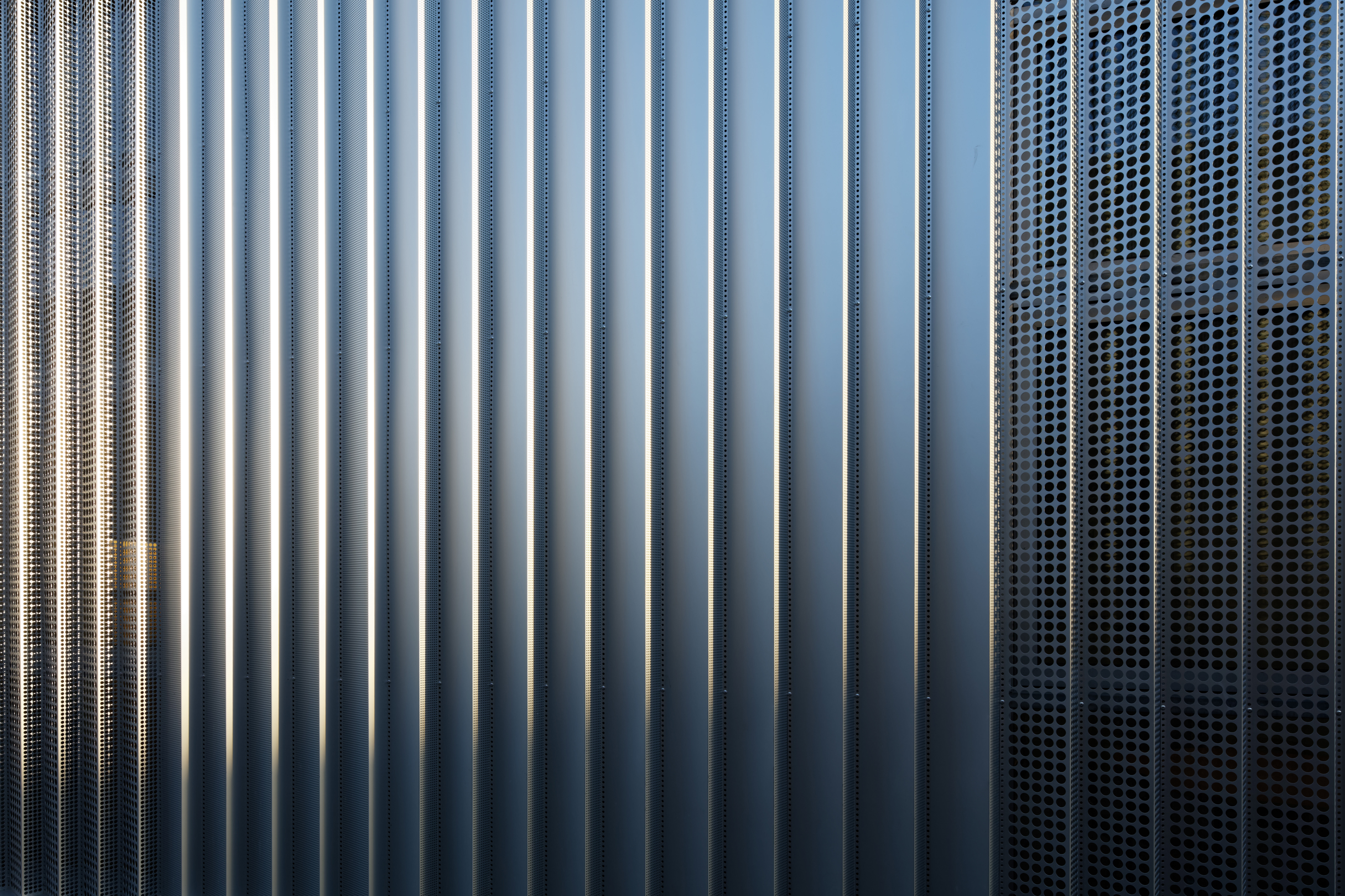 Il sistema di facciata, particolarmente leggero, è composto da pannelli metallici traforati, con alcuni elementi fissi e altri scorrevoli, la cui funzione è sia di filtro protettivo verso la strada che di schermatura solare dei raggi provenienti da est e ovest.