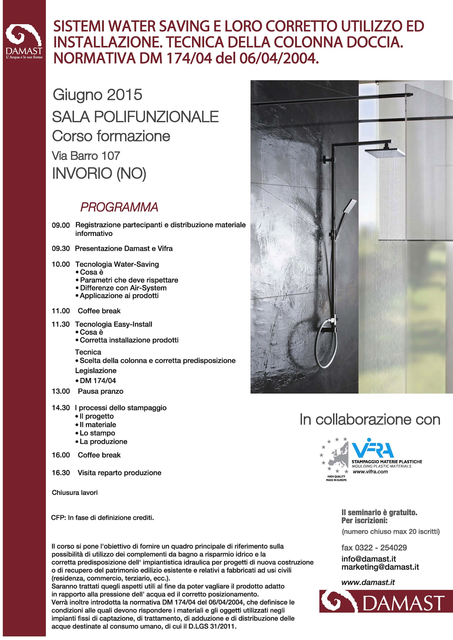 Il corso, dal titolo «Sistemi Water-Saving e loro corretto utilizzo e applicazione. Tecnica della colonna doccia. Normativa Dm 174/04 del 06/04/2004», che si terrà il 26 giugno, verrà riproposto nuovamente il 3 luglio. L’Ordine degli Architetti di Novara riconoscerà 8 crediti formativi ai partecipanti.