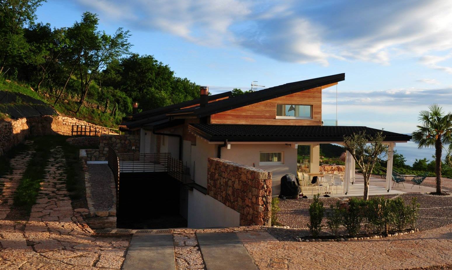 Le rocce risultanti dalla fase di scavo sono state conservate ed utilizzate nella risistemazione degli spazi esterni (muri di contenimento, camminamenti, gradini…).