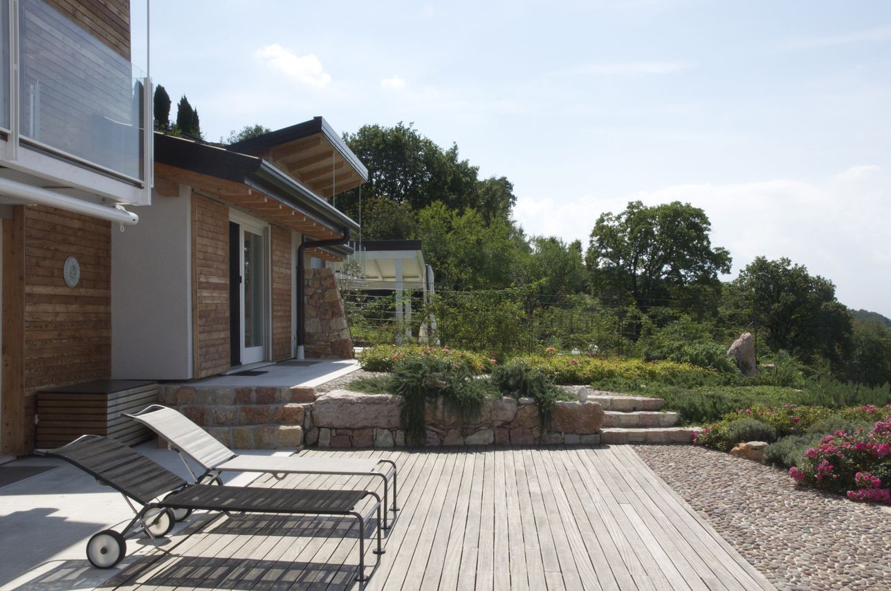 Sul versante ovest del Lago di Garda, su un terreno degradante, le nuove costruzioni con caratteristiche costruttive locali combinate con materiali e impianti biosostenibili risultano in armonia con le preesistenze del luogo e con in caratteri insediativi della tradizione locale.