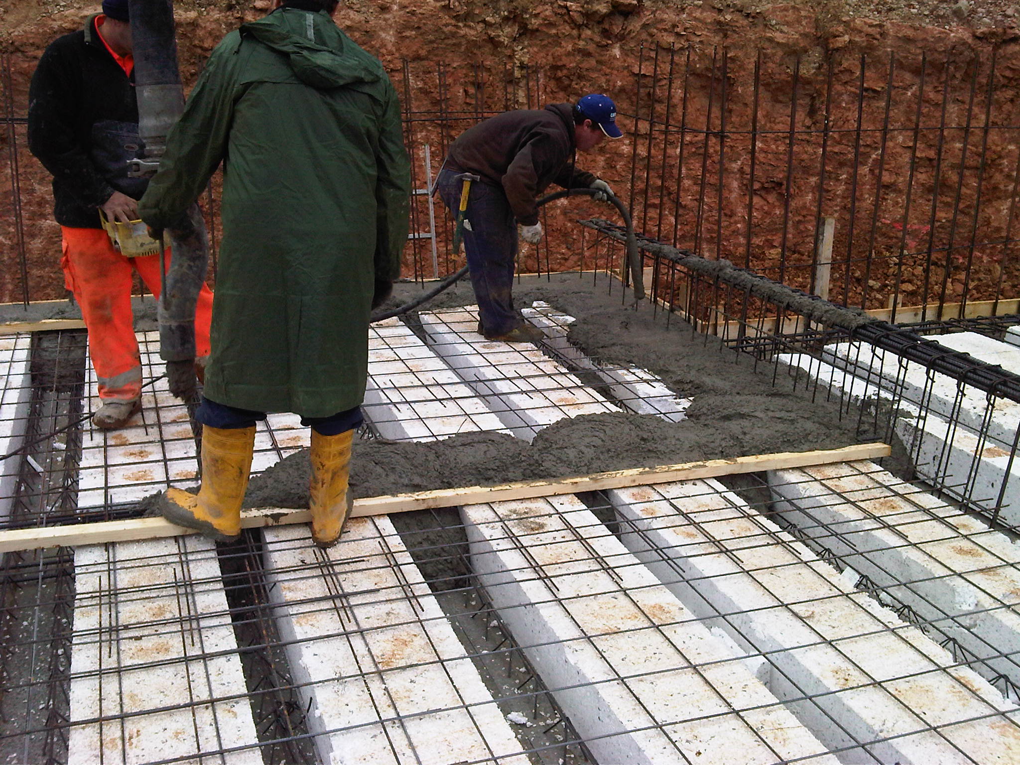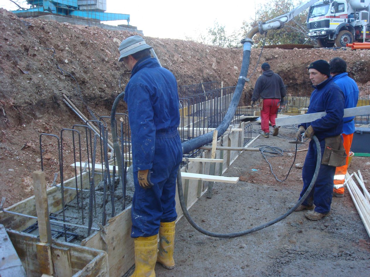 Una volta preparato il terreno, si è partiti con la realizzazione dei garage interrati realizzati interamente in cemento armato con isolante esterno. La scelta di utilizzare il cemento nelle porzioni di fabbricato situate sotto il livello del terreno nasce dalla necessità di realizzare delle fondazioni solide e durevoli nel tempo.