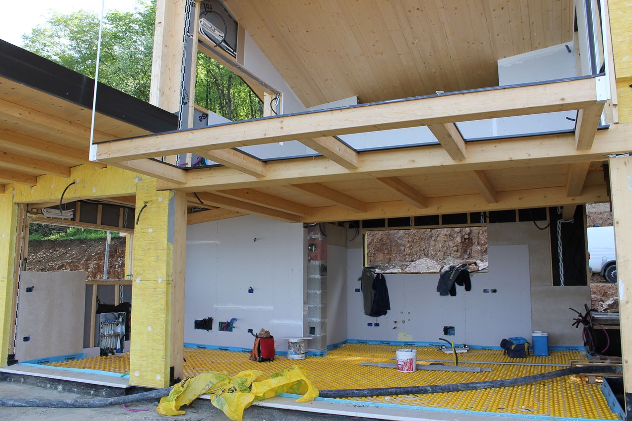 Una volta chiusi i pacchetti isolanti, verificata la tenuta all’aria e la giunzione delle strutture secondo le indicazioni dei calcoli strutturali, si è potuto proseguire con l’installazione degli impianti. Le tubazioni e i cavi elettrici sono stati posizionati in un’intercapedine posta in aderenza alla struttura lignea e poi chiusi con dei semplici pannelli in cartongesso.