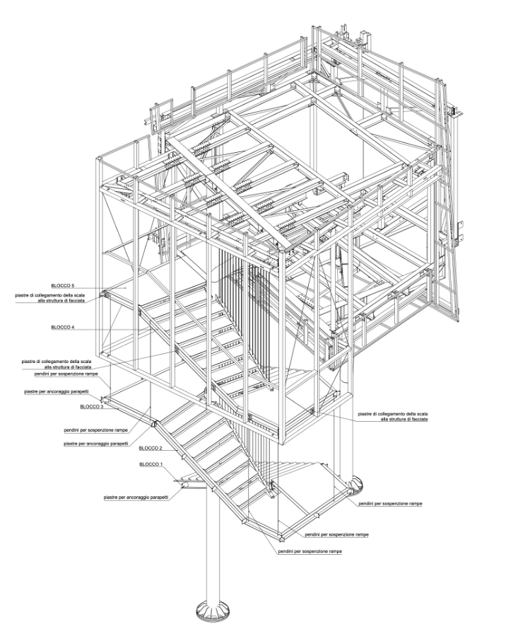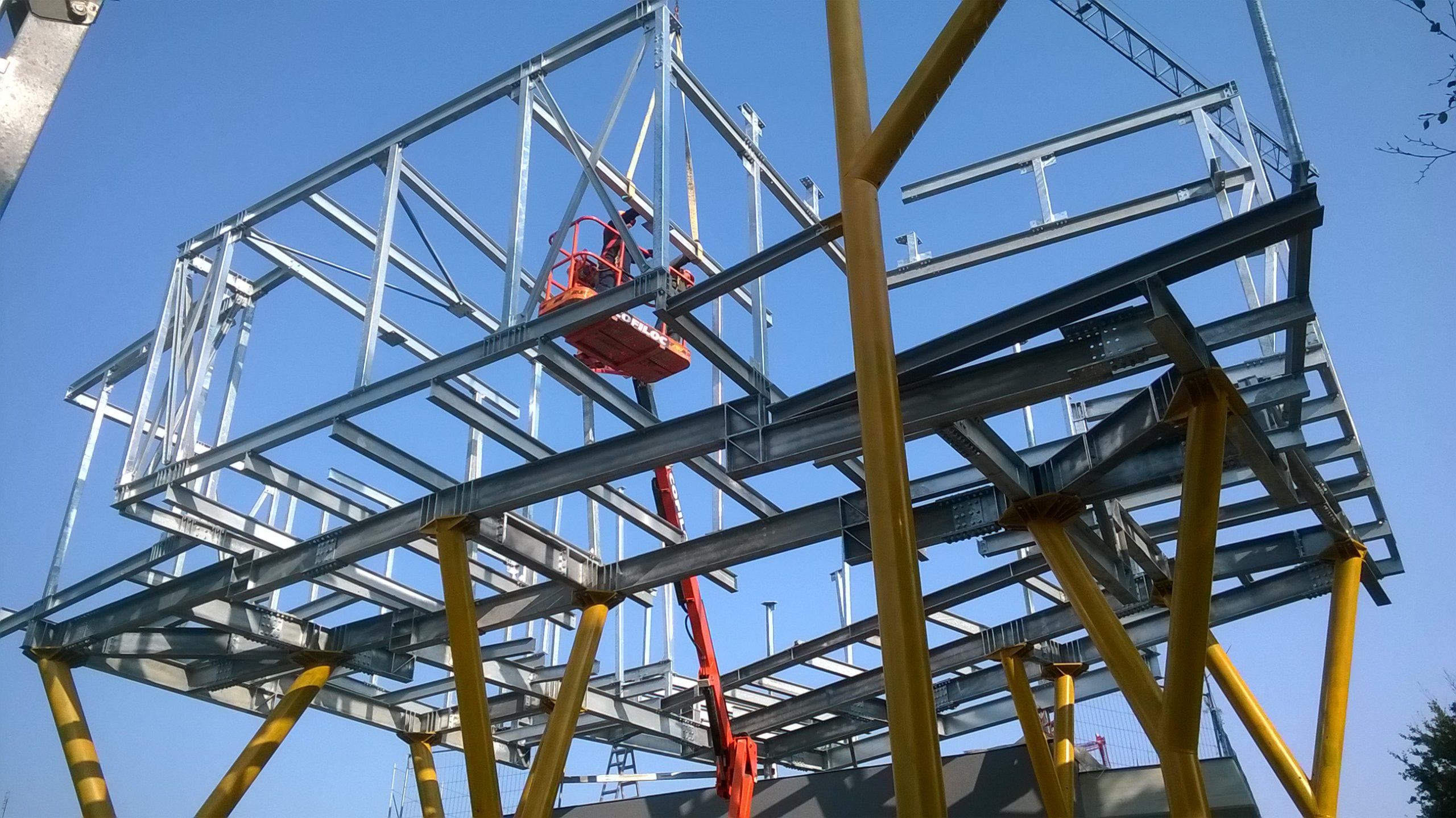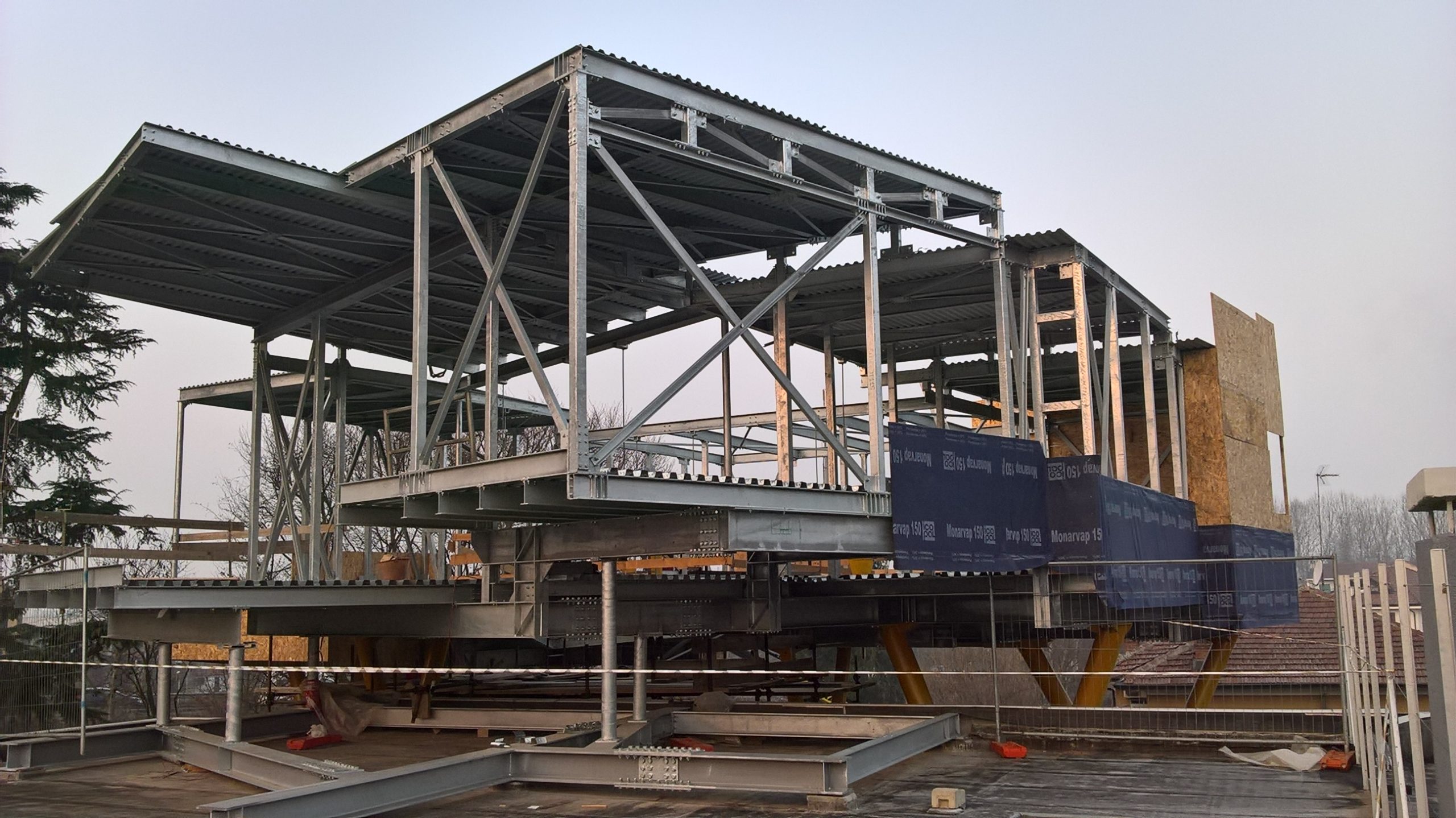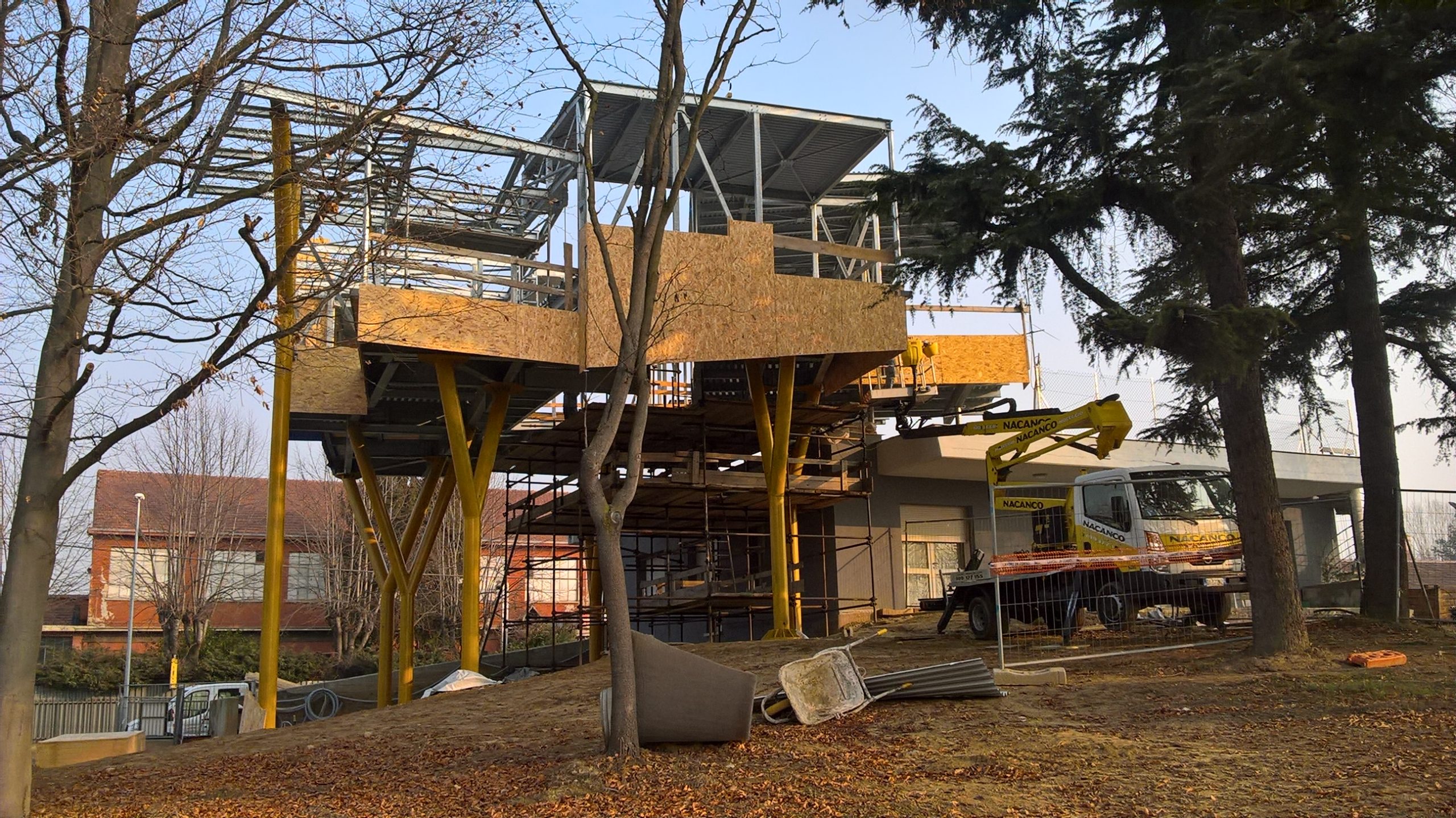 La struttura del nuovo intervento è prefabbricata in acciaio zincato e poggia in gran parte su alti pilastri metallici a forcella; una sezione minore del costruito poggia invece sulla struttura di calcestruzzo della villetta degli anni Settanta.