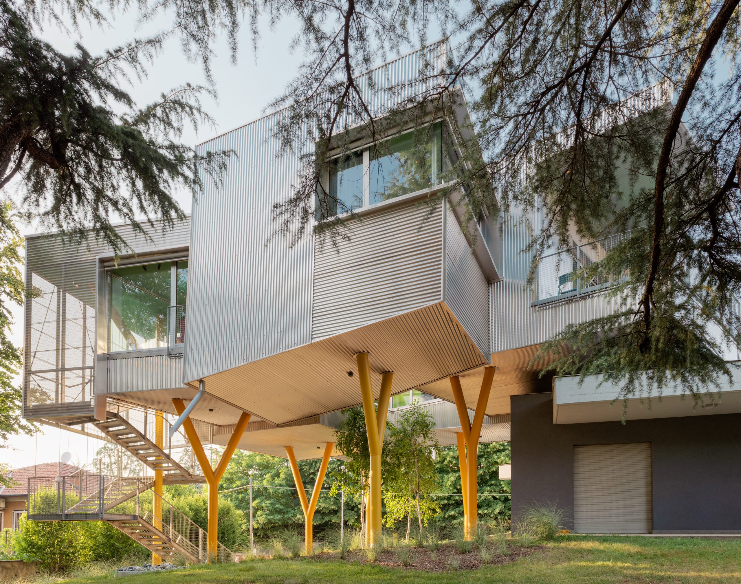 Alla base del progetto, la sperimentazione architettonica adattata a uno spazio “costretto”, in questo caso sia da una costruzione esistente – una villetta degli anni Settanta – che da un gruppo di alberi che committenti e progettisti voleva tutelare.