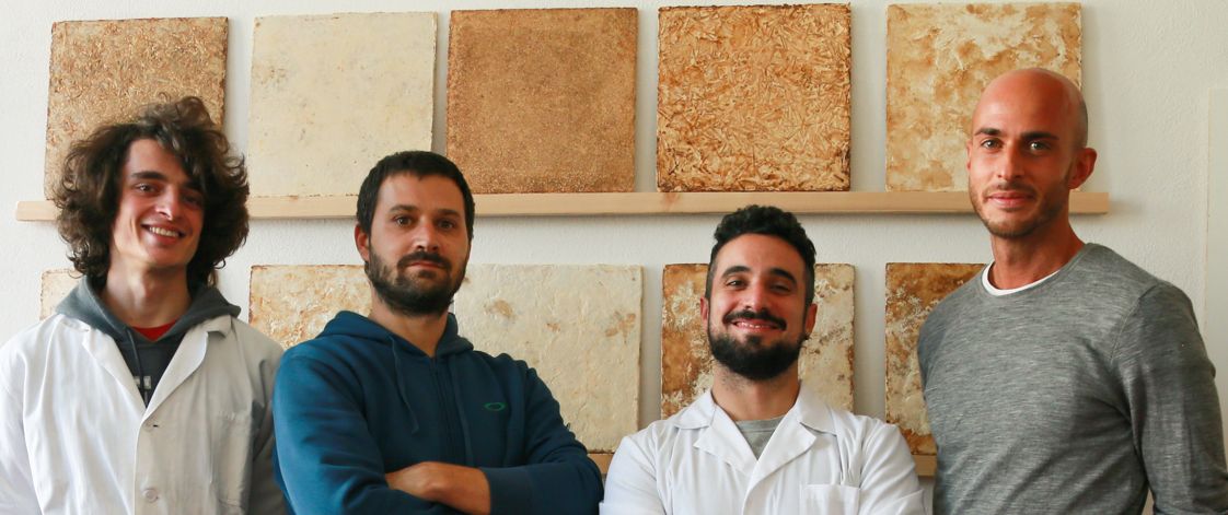 Anima di Mogu sono quattro giovani poco più che trentenni – Federico Maria Grati, Stefano Babbini, Natalia Piatti e Maurizio Montalti, concept designer e fondatore di Officina Corpuscoli ad Amsterdam – che hanno deciso di mettere a frutto la loro laurea in ingegneria per creare materiali dagli scarti di produzione alimentare.