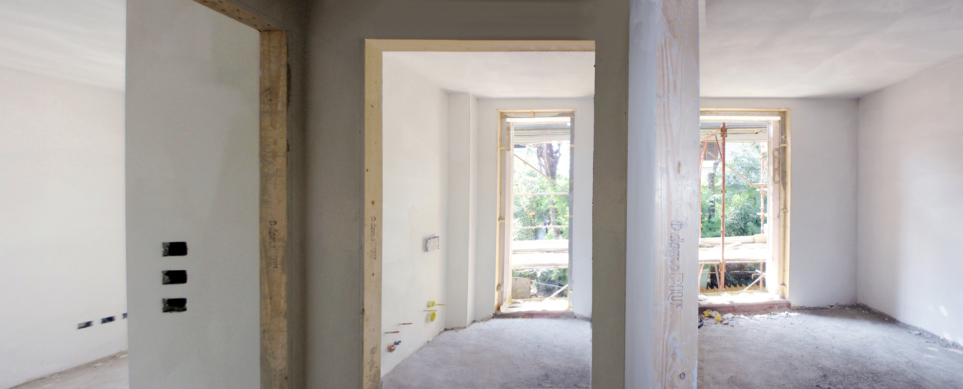 Le finiture. Nel vano scala e negli alloggi le pareti e i soffitti sono stati rifiniti con malta premiscelata, di intonaco del tipo civile liscio a base di calce e cemento premiscelati, eseguito a macchina mediante la posa di un primo strato di malta a media granulometria e un secondo di finitura a granulometria fine tirata a frattazzo.