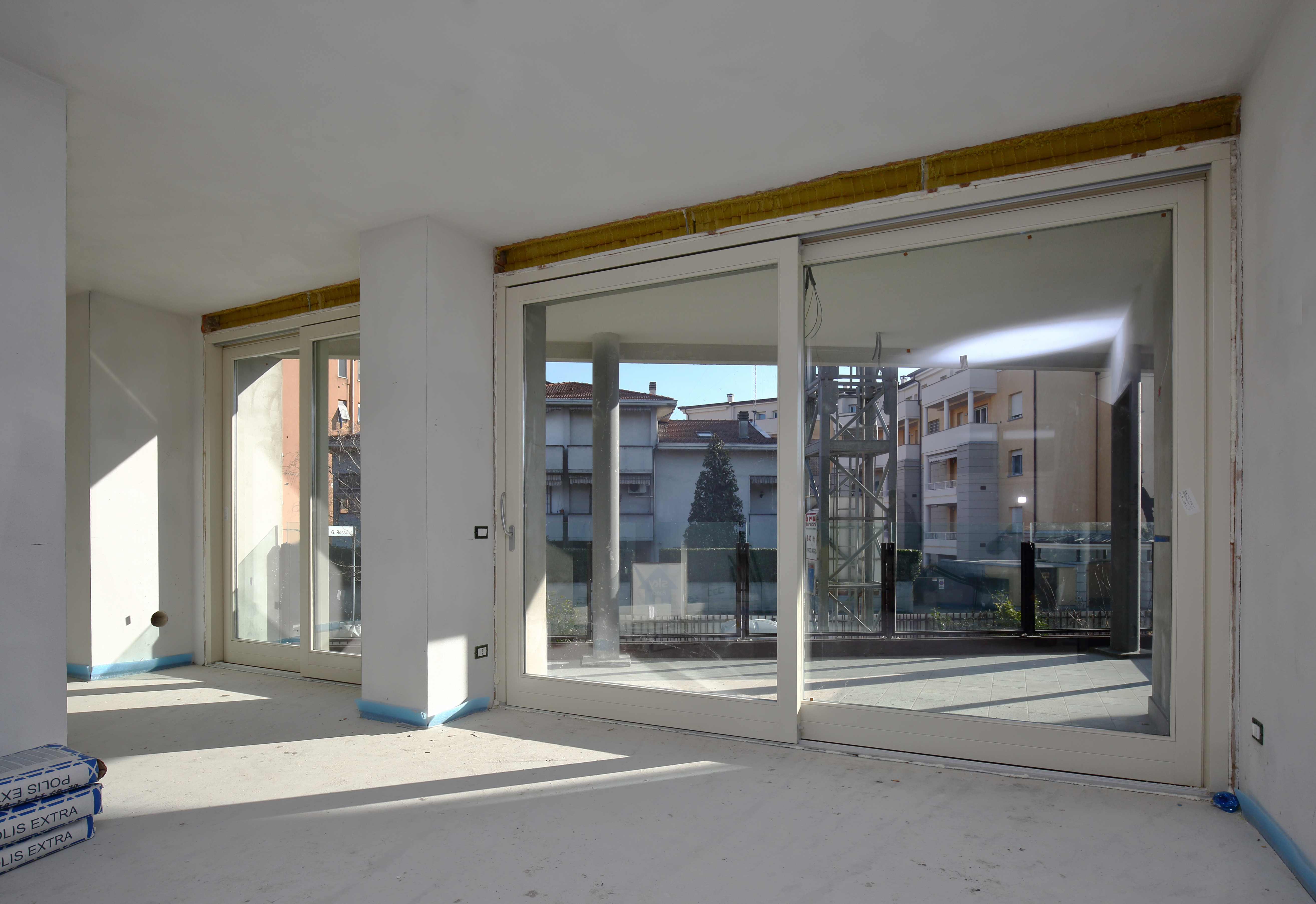 Serramenti esterni e interni. Il portone principale di accesso al vano scala, così come la vetrata, è stato realizzato in alluminio verniciato, dotato di vetri stratificati antinfortunistica.
