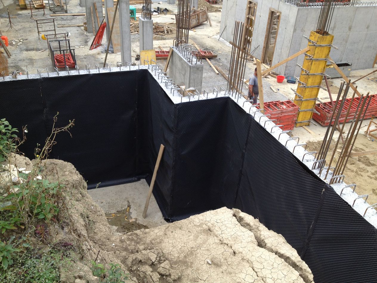 Murature in c.a. Le murature a contatto con il terreno sono state gettate in opera in calcestruzzo armato, classe di resistenza C 28/35, armato con ferro B 450 C, nella quantità determinata dai calcoli strutturali eseguiti rispettando la più recente normativa antisismica. Le murature interrate sono state protette dalle infiltrazioni di umidità con fogli di guaina bituminosa con posa di membrana bugnata a separazione del reinterro.