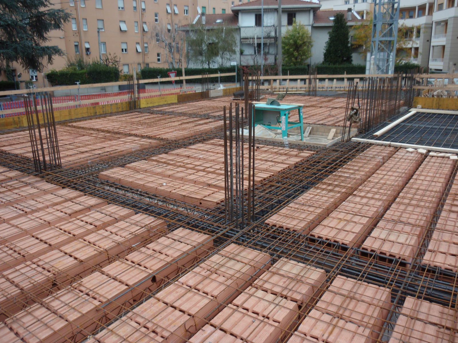 Solai. I solai delle autorimesse sono stati costruiti con lastre tralicciate di cemento tipo “predalles”. I solai di tutti i piani orizzontali e la copertura sono stati realizzati con travetti e pignatte in laterizio e getto di completamento in a.a. I solai di calpestio dei piani abitabili sono stati calcolati per una portata utile di 560 kg/mq oltre al peso proprio.