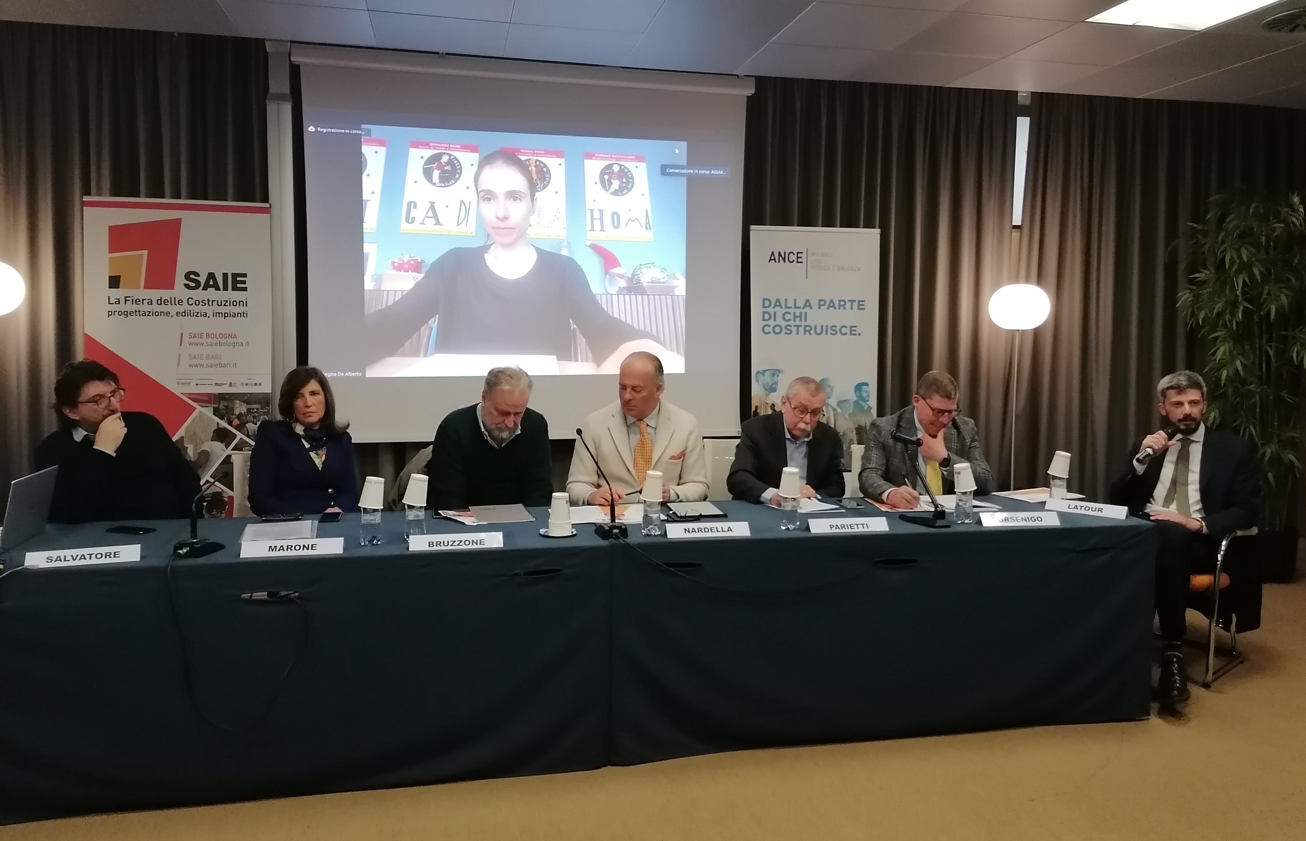 Alla conferenza stampa hanno partecipato Regina De Albertis, Presidente Assimpredil Ance; Paola Marone, Presidente Federcostruzioni; Enzo Parietti, Presidente Conpaviper; Lorenzo Orsenigo, Presidente AIS – Associazione Infrastrutture Sostenibili; Walter Salvatore, Presidente Consorzio Fabre; Antonio Bruzzone, Direttore Generale BolognaFiere; Ivo Nardella, Presidente Gruppo Tecniche Nuove/Senaf e Emilio Bianchi, Direttore Generale Senaf/SAIE.