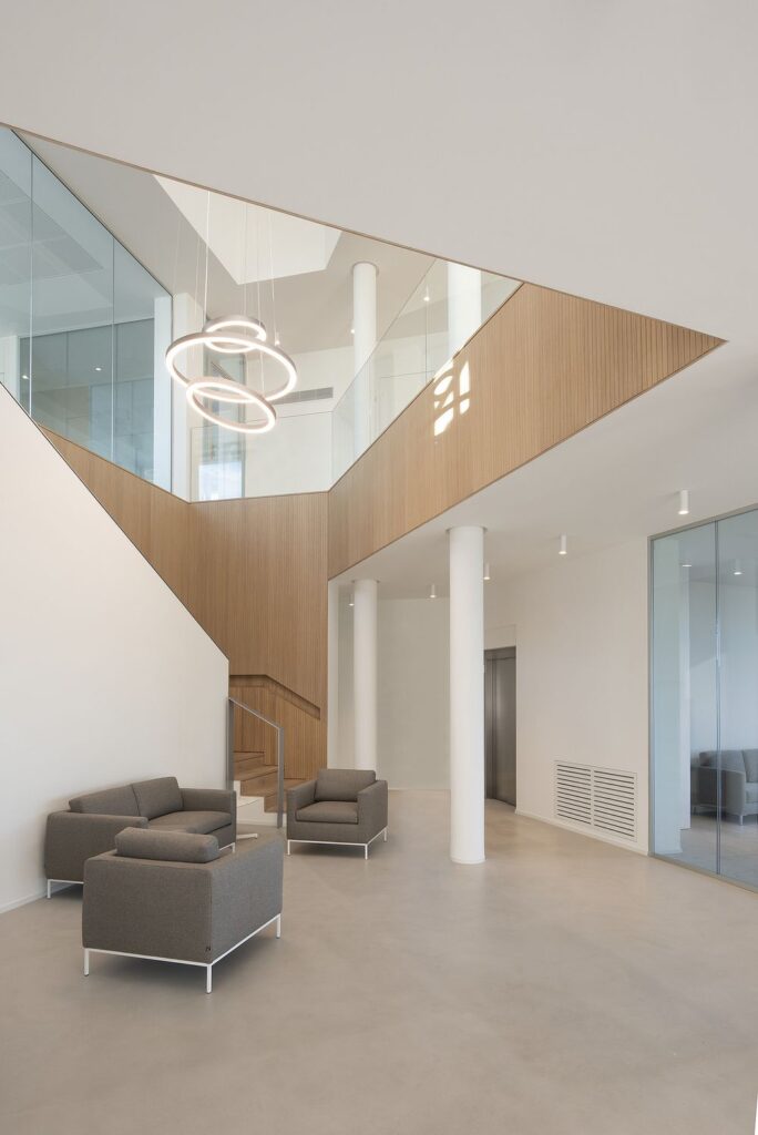 La superficie, nei formati 60x20cm e 60x60cm, copre circa 1800 metri quadri e ripropone le creste tipiche del cemento rullato con un’interessante profondità ottica. Grazie all’effetto opaco e morbido al tatto enfatizzato da una leggera patinatura, l’atmosfera in ufficio diventa intensa e avvolgente.