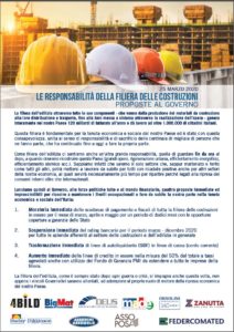 La filiera dell’edilizia, come è sempre stato dopo ogni guerra o crisi, s’impegna anche questa volta, non appena i vincoli Governativi saranno allentati, ad adempiere al proprio ruolo di motore della ripresa economica del nostro Paese.