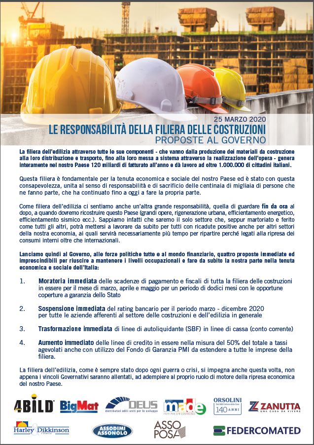 1). A sottoscrivere il documento contenente queste proposte sono le associazioni di categoria Federcomated, Federcostruzioni, Assoposa (Associazione nazionale imprese di posa e installatori di piastrellature ceramiche), Assodimi Assonolo (Associazione dei distributori e noleggiatori di macchine strumentali), i gruppi di rivenditori di materiali edili BigMat, Deus, Made, i multipoint 4Bild, Orsolini, Zanutta e Harley&Dikkinson, l’Arranger tecnologico, finanziario e di garanzia rivolto a chi opera nella riqualificazione e valorizzazione degli edifici. Dieci realtà che scendono in prima linea per rappresentare l’intero comparto del mondo delle costruzioni italiano.