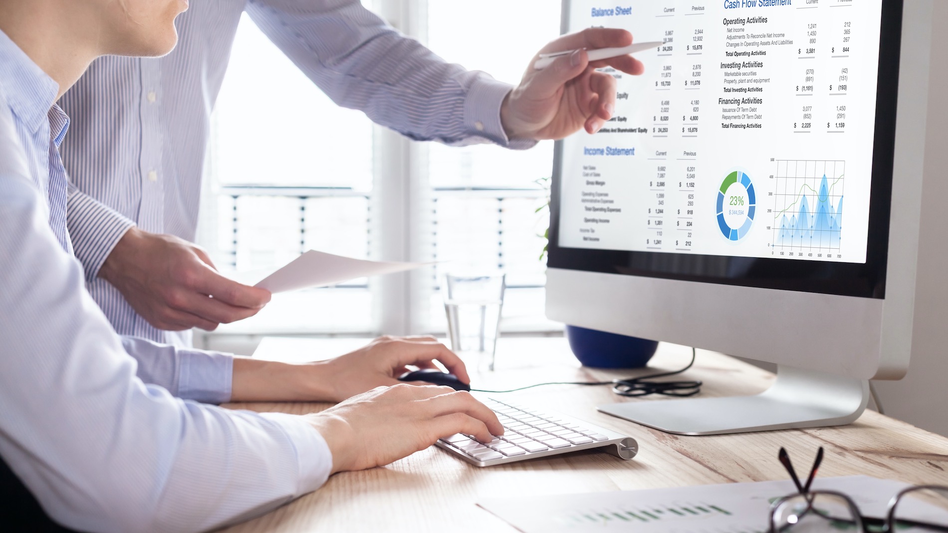 Accountants working on financial statement on computer screen in office. Team of consulant auditing finance and business operations reports with income data. Corporate management and governance