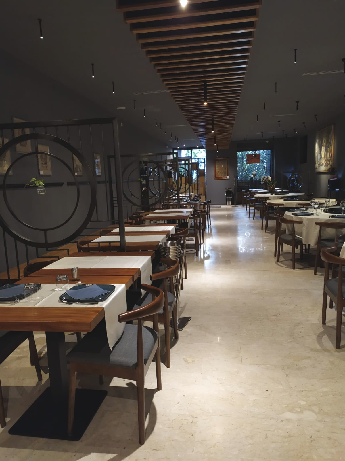 Il progetto dell’arch. Maria Dalmira de Camargo Andrade ha previsto la ristrutturazione dello spazio preesistente, caratterizzato da controsoffitto in cartongesso, pareti bianche e pavimento in marmo pregiato, che necessitava anche di un intervento di correzione del riverbero e di miglioramento dell’isolamento acustico, dal momento che il ristorante si trova al piano terra di un complesso residenziale.