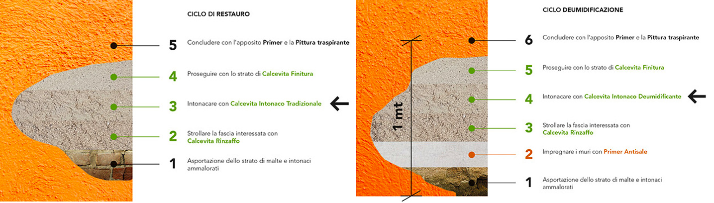 I prodotti della Linea Calcevita e Sanierputz sono invece stati formulati per il recupero di murature interessate da fenomeni di degrado dovuti alla presenza di umidità da risalita capillare, da condensazione o meteorica. La loro formulazione li rende entrambi idonei ad impieghi in bio-edilizia, ripristino e restauro.