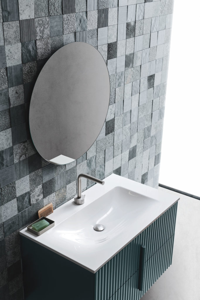 La composizione Code 12 di Arbi Arredobagno è composta da basi porta-lavabo in finitura laccato Grigio Baltico opaco con maniglia in legno massello laccata in tinta e lavabo consolle Letter 86 in mineralguss (design by Meneghello Paolelli Associati). Le specchiere Light tonde con luce led perimetrale e le colonne a destra in legno di eucalipto opaco completano l’ambiente. Misura: L 86 x P 50,8 cm.