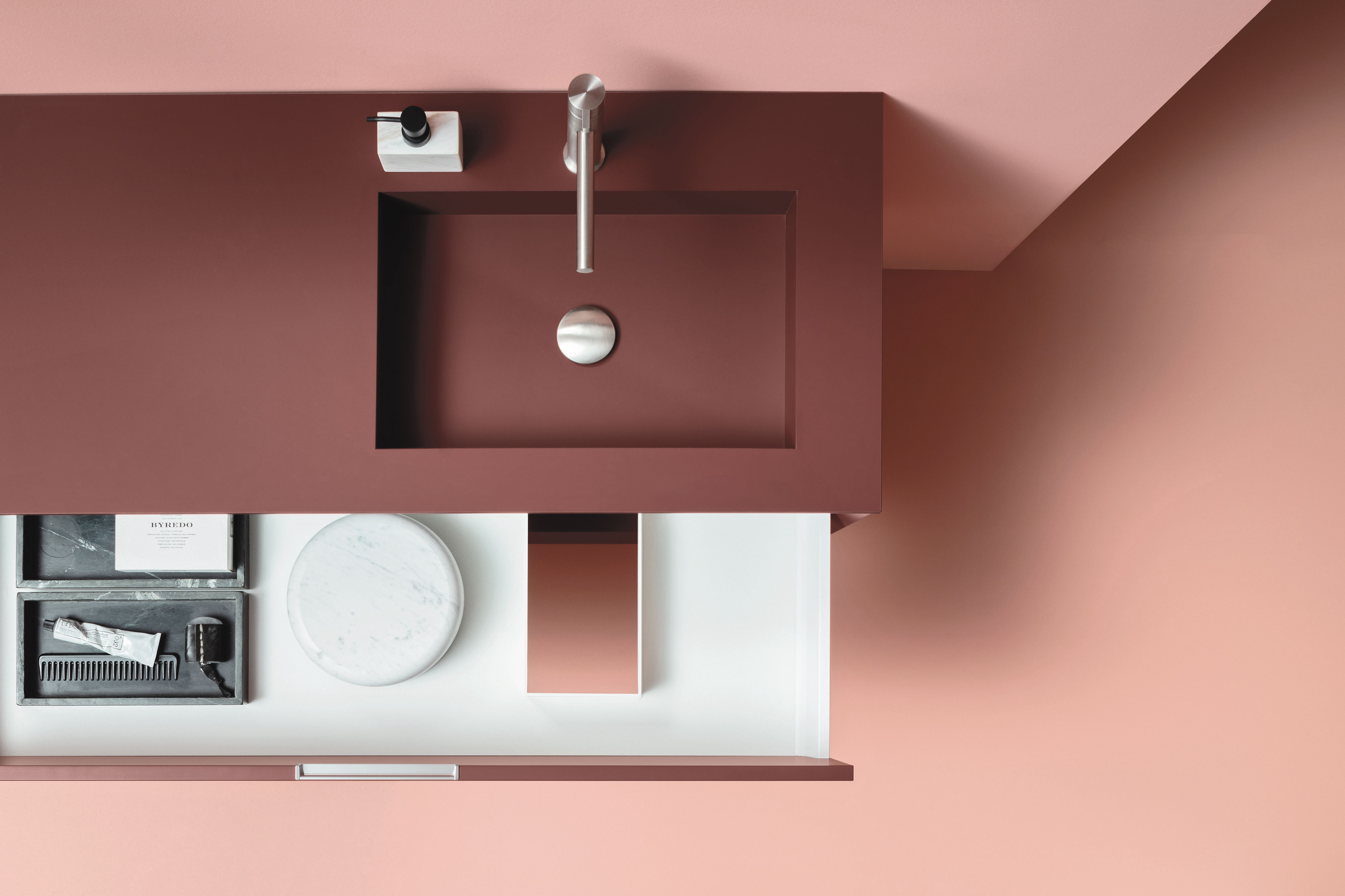 Il Rosso Casale è il protagonista assoluto della composizione Materia Vip 05 di Arbi Arredobagno. La base monoblocco con cassettone e vano a giorno si abbina armoniosamente con il piano top in fenix con lavabo integrato Kuki. La specchiera Boheme con profilo in alluminio inox e led superiore e inferiore definisce lo spazio e dona luce e freschezza all’ambiente. Misura: L 120,6 x P 50 x H51 cm