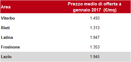 Per quanto riguarda i prezzi medi delle case, la regione mostra un andamento migliore della media nazionale: durante la crisi le quotazioni medie italiane sono scese del 16% e solo del 8% nel Lazio, anche se ci sono difformità tra le diverse città (ad esempio meglio Roma e peggio Frosinone).