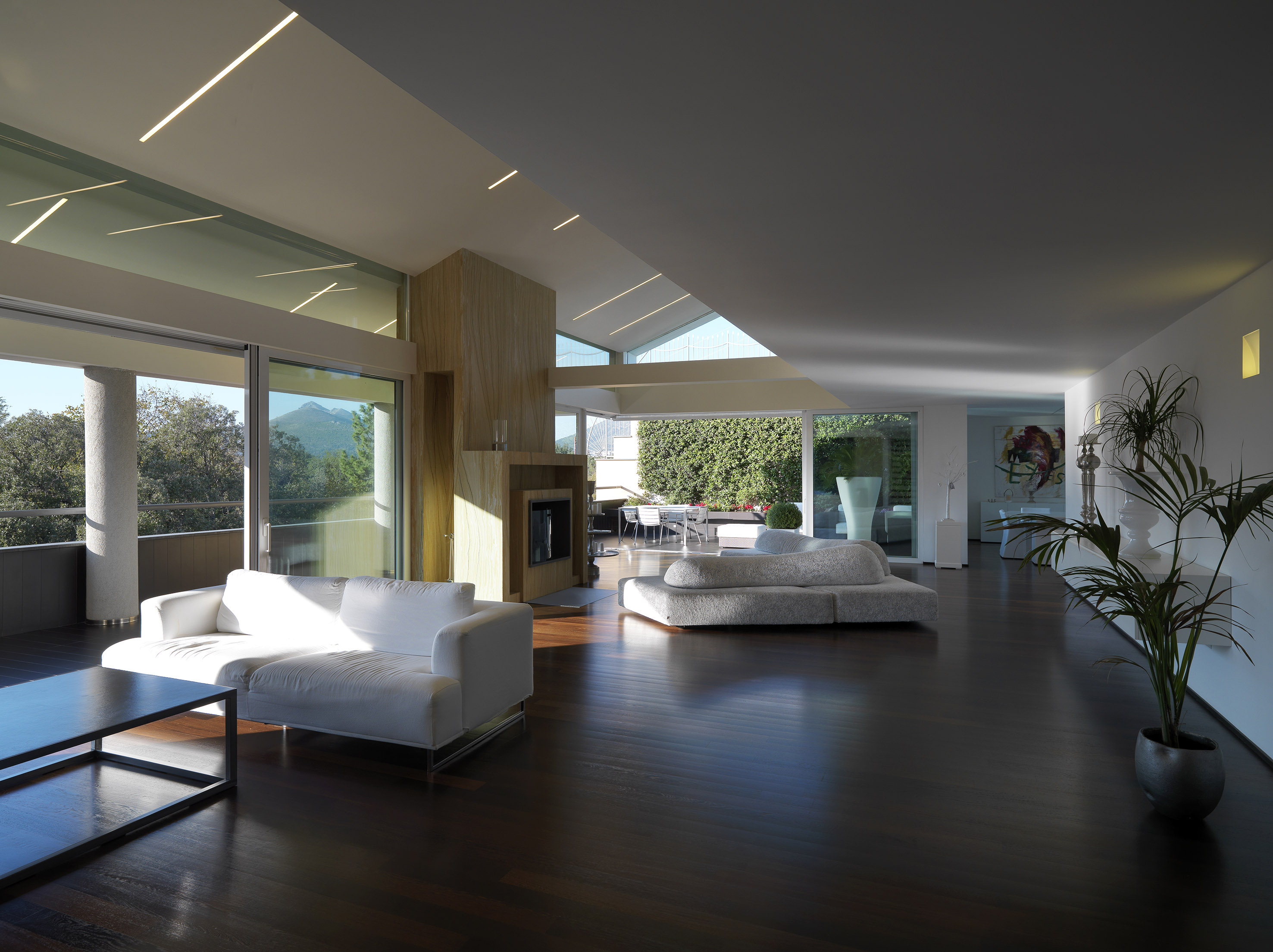 «Avevamo a disposizione superfici disposte su due livelli, situate a un’altezza elevata e caratterizzate da una vista spettacolare sul parco. Il progetto ha lavorato per sottrazione rispetto alla frammentazione spaziale preesistente, eliminando tutte le murature superflue, interne ed esterne, fino a ottenere un ambiente polifunzionale fluido e continuo, inondato dalla luce naturale. Le scelte progettuali estetiche e tecniche sono state condivise con i committenti. L’apparato decorativo è limitato a pochi oggetti artistici di pregevole fattura, per nulla invasivi. In questo modo si enfatizza il rapporto fra interno ed esterno, privilegiando il ruolo scenografico del parco. Dal punto di vista tecnologico, uno dei particolari più interessanti di tutta l’abitazione è rappresentato dagli scorrevoli con apertura angolare, i cui telai in alluminio sono sagomati in modo che l’uno funga da battuta all’altro, senza alcun sostegno verticale. Una volta aperto il serramento, le due ante di sinistra, dopo essere state sovrapposte una sull’altra, possono scomparire in un apposito alloggiamento creato nel muro in corrispondenza del camino. La complessità di questo nodo angolare è fondamentale per l’estetica dell’intera parete trasparente e ha richiesto una notevole abilità da parte dei tecnici posatori della Di Monaco Serrramenti, che hanno realizzato in cantiere e allestito in opera anche tutto l’occorrente per la motorizzazione a scomparsa delle ante».