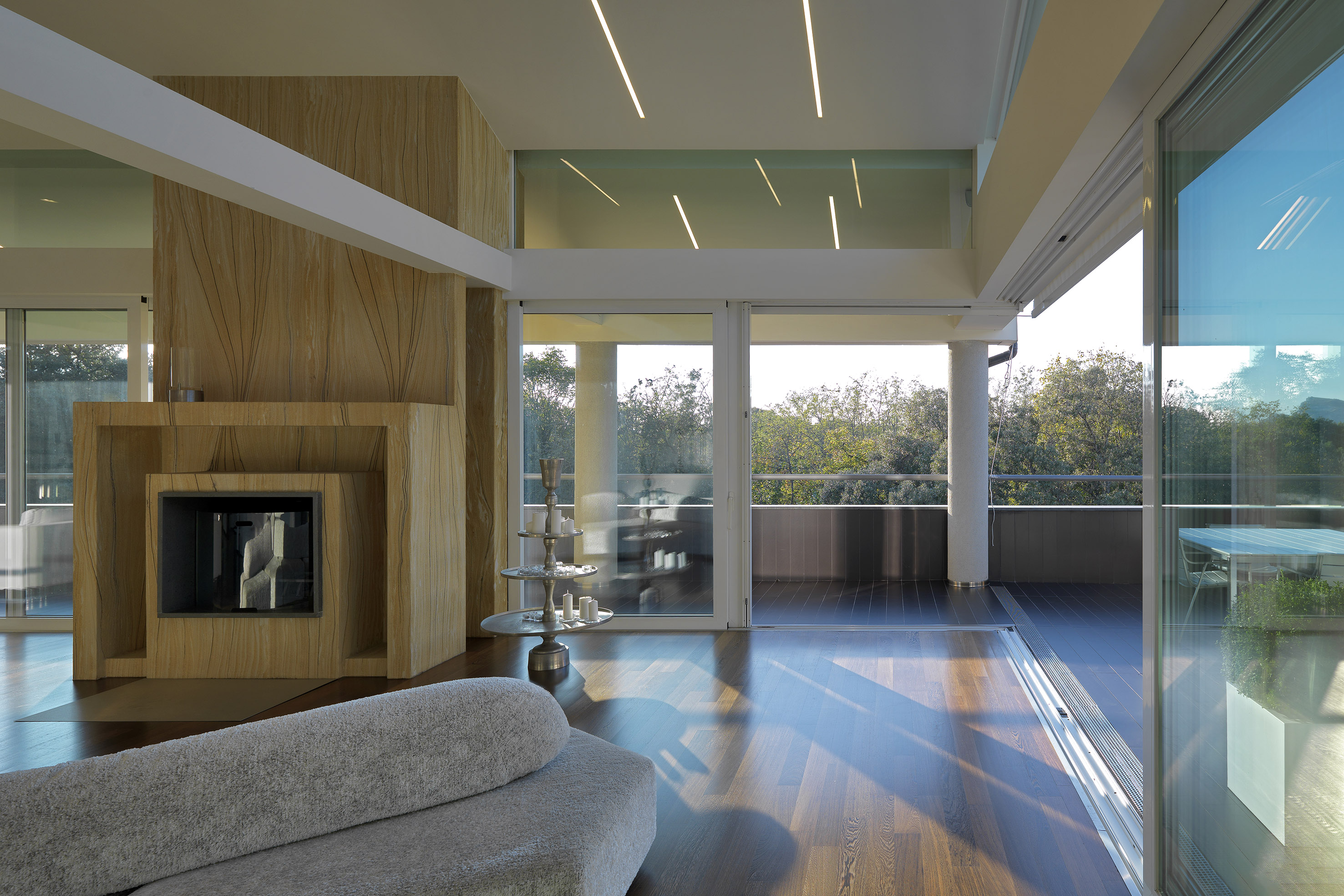 L’ambiente principale dell’abitazione è formato da un ampio living open space il cui fulcro è rappresentato dalla zona relax, arredata con un divano tessile e un suggestivo caminetto. Attorno a quest’area s’inseriscono gli altri locali della casa: la cucina, la zona pranzo, le camere con servizi interni e il soppalco aperto con biblioteca e studio, tutti affacciati lungo le vetrate perimetrali scorrevoli che permettono il collegamento diretto con la terrazza.