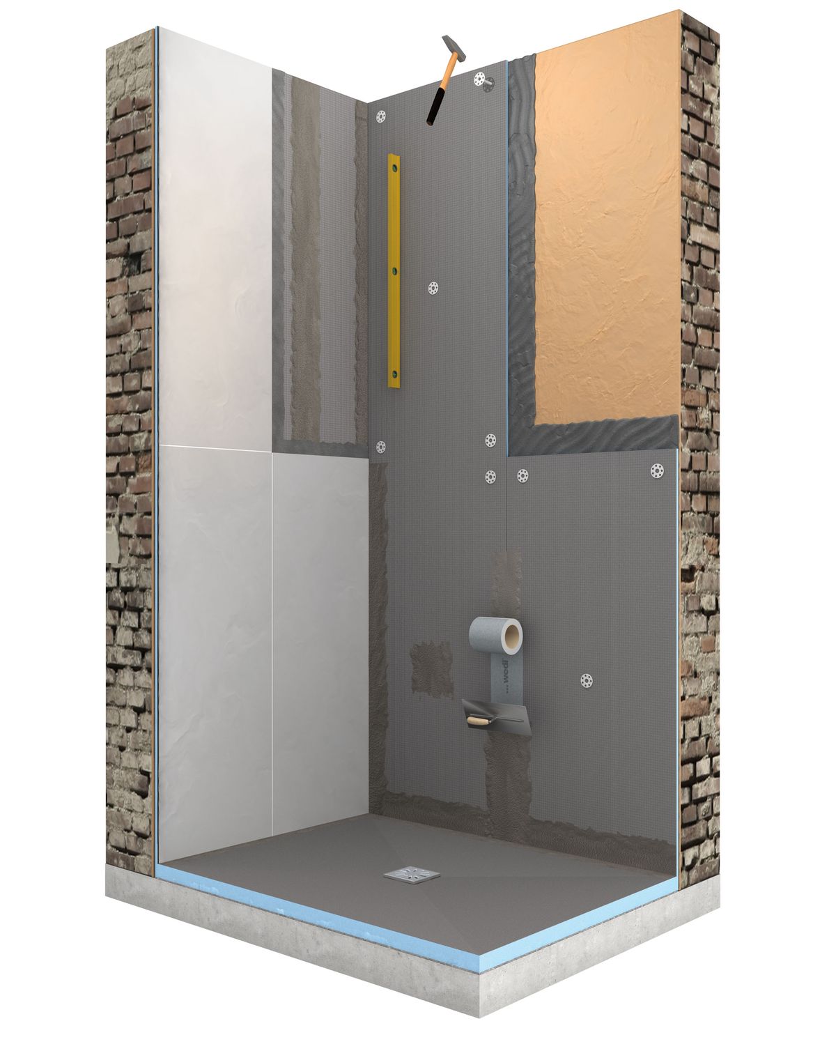 Wedi Shower Kit è un set completo che, in un’unica confezione, contiene tutto il necessario per costruire, in modo rapido e sicuro, una doccia d’angolo a filo pavimento.