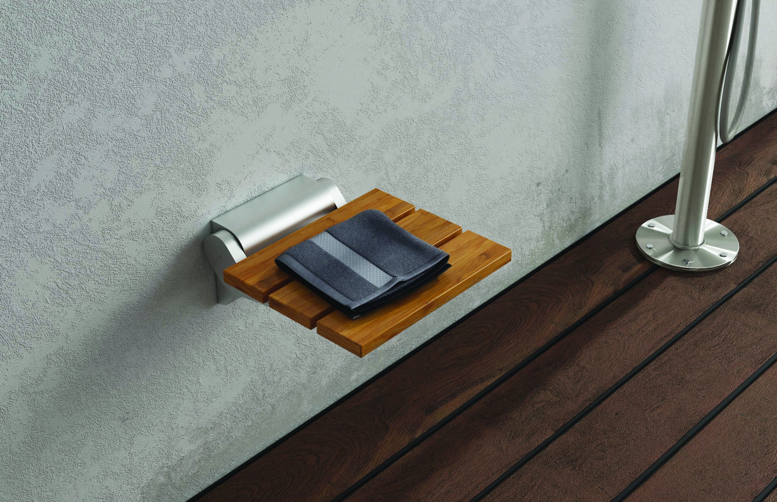 La seduta Bamboo, parte del progetto Damast “Design for Humans”, è una seduta comfort pieghevole in bambù naturale (dimensioni 390×350 mm), composta da tre doghe rettangolari e un robusto telaio in acciaio inossidabile resistente all’acqua. Ancorata saldamente al muro, è in grado di sostenere un peso massimo di 130 kg. L’utilizzo del bambù come materiale naturale, resistente ed ecologico, sottolinea l’attenzione di Damast per la sostenibilità.