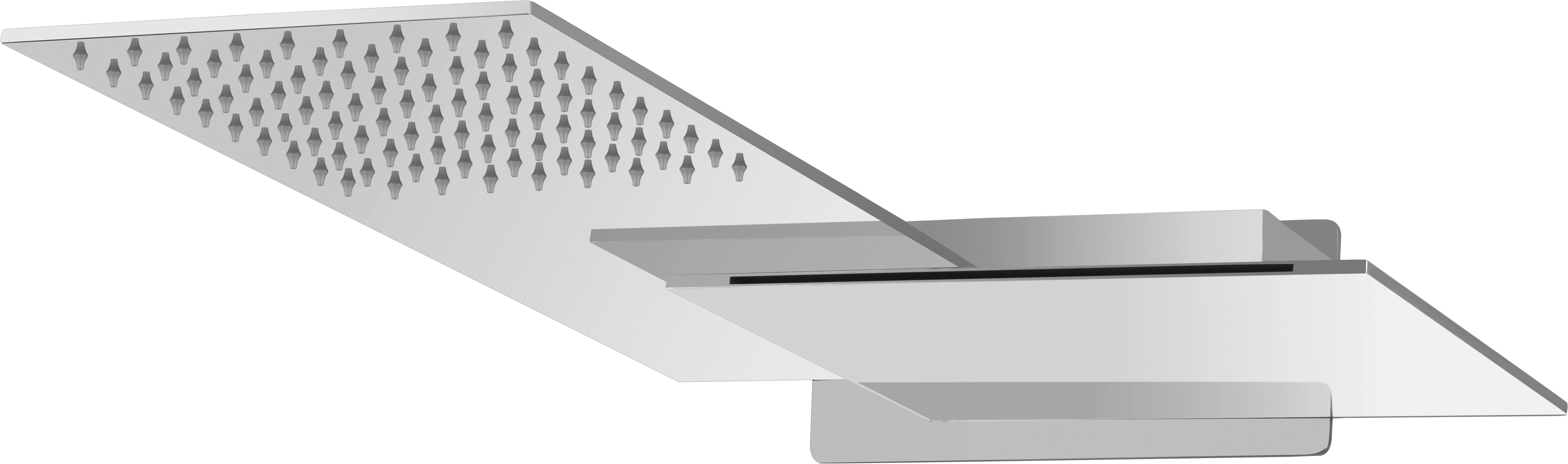 Un primo soffione rettangolare si protende dal muro per circa mezzo metro (490×180 mm x 5 mm) e presenta 90 fori con ugelli flessibili – in silicone per la facile rimozione del calcare – in grado di fornire un getto intenso, a pioggia. Immediatamente al di sotto (e incorporato allo stesso supporto a muro) si sviluppa un altro soffione, con bocca di dimensione più piccola e forma pressoché quadrata (230×210 mm x 5 mm) dotata di un taglio orizzontale di ben 200 mm. Permette di erogare una cascata d’acqua massaggiante d’eccellenza grazie all’ampiezza del getto che scaturisce dal taglio (200 mm di larghezza per 3 mm di altezza). I soffioni sprigionano tutto il loro effetto benefico singolarmente in maniera alternata.
