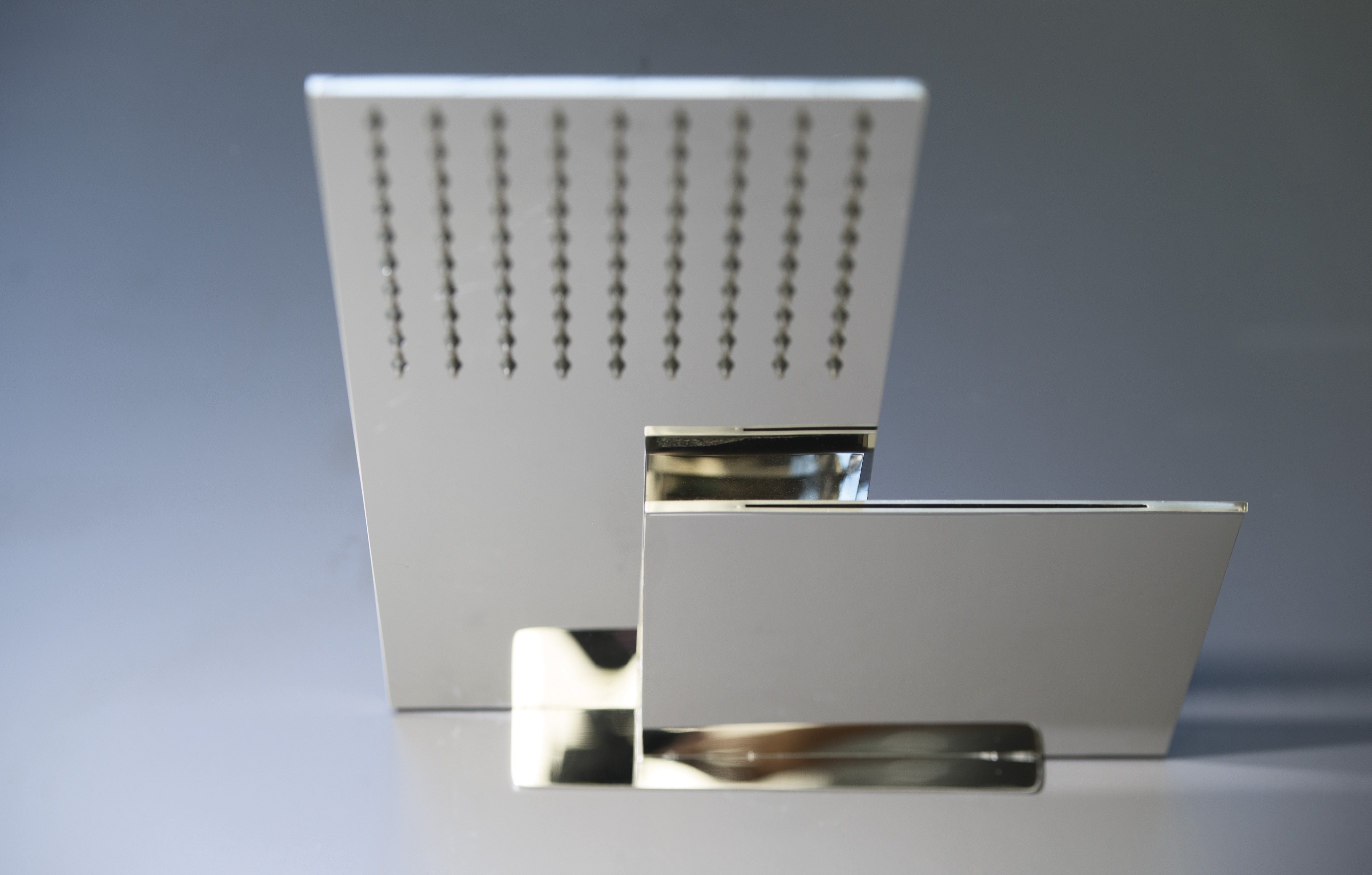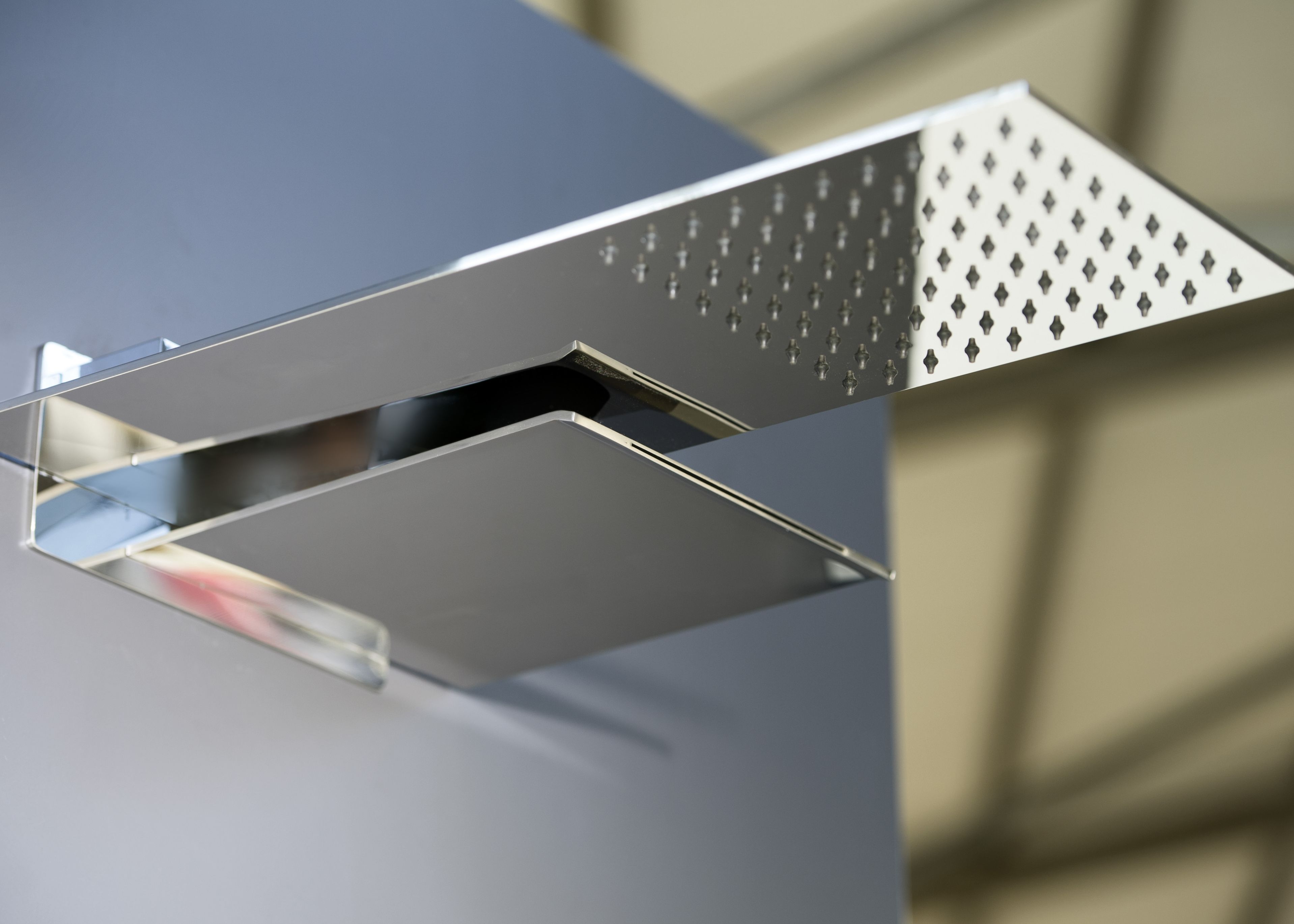 Un primo soffione rettangolare si protende dal muro per circa mezzo metro (490×180 mm x 5 mm) e presenta 90 fori con ugelli flessibili – in silicone per la facile rimozione del calcare – in grado di fornire un getto intenso, a pioggia. Immediatamente al di sotto (e incorporato allo stesso supporto a muro) si sviluppa un altro soffione, con bocca di dimensione più piccola e forma pressoché quadrata (230×210 mm x 5 mm) dotata di un taglio orizzontale di ben 200 mm. Permette di erogare una cascata d’acqua massaggiante d’eccellenza grazie all’ampiezza del getto che scaturisce dal taglio (200 mm di larghezza per 3 mm di altezza). I soffioni sprigionano tutto il loro effetto benefico singolarmente in maniera alternata.