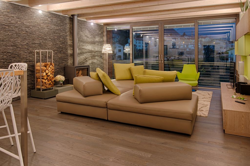 L’architettura di questo ampliamento è costituita da un parallelepipedo in legno che ospita un grande open space dedicato al living e alla cucina (serviti da un bagno ricavato da una ex camera) in cui si crea un cannocchiale visivo verso il paese e la montagna, dando vita a grandi aperture che mettono in contatto gli interni residenziali con l’ambiente circostante.