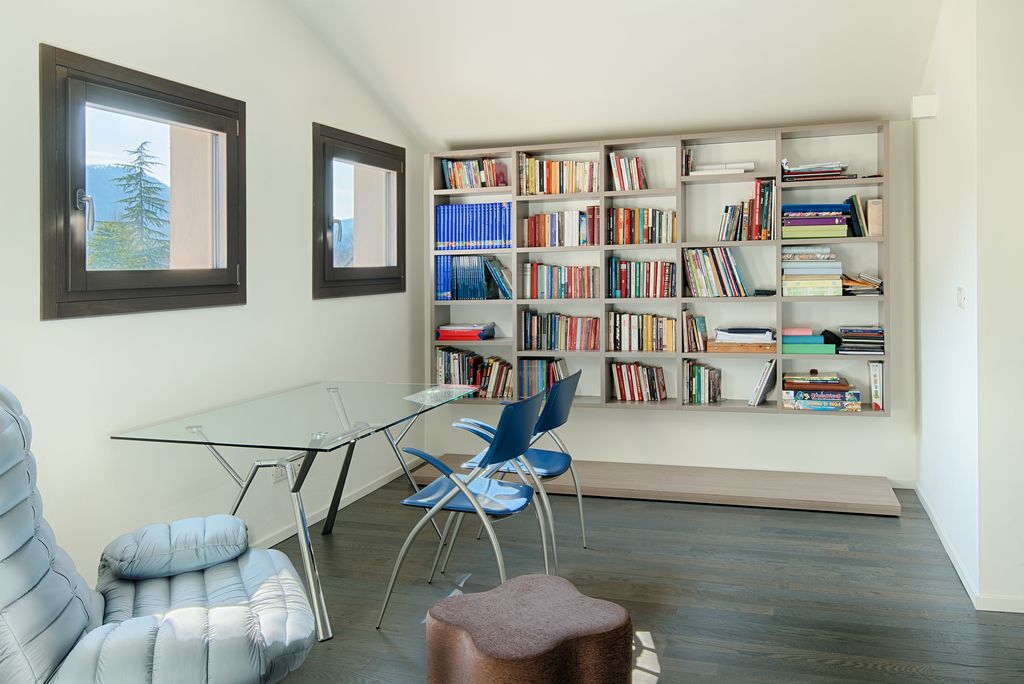 Come in tutto il resto dell’abitazione tranne che nei bagni, il pavimento è in listoni di legno di roble chiaro, con finitura opaca che contrasta efficamente con una parete in pietra a spacco di colore grigio-nero. A soffitto, travi in lamellare di abete sbiancato. L’uso intensivo del legno caratterizza sia le parti strutturali che l’arredo e i serramenti, come le porte interne e tutte le finestre, che hanno la parte indoor in legno e quella esterna in alluminio.