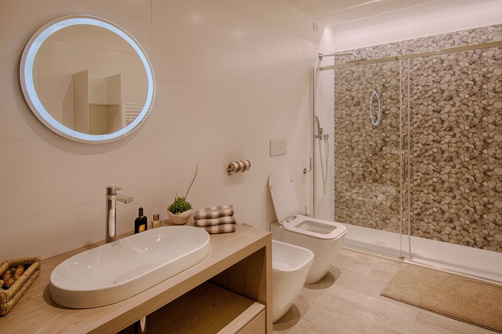 Per quanto riguarda i due bagni (uno grande collegato alla zona notte padronale e uno più piccolo, di servizio alle due camere ospiti) sono improntati alla massima semplicità e caratterizzati da tonalità chiare e naturali.