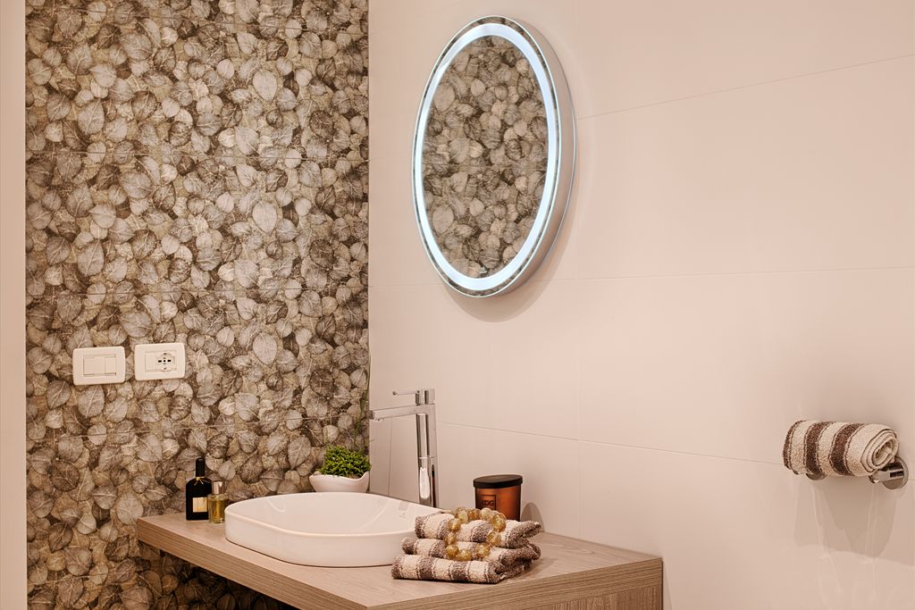 Dal punto di vista decorativo, nel bagno padronale i rivestimenti ceramici sono caratterizzati da porzioni delle superfici che ripropongono, nelle sfumature del grigio, il tema naturalistico della foglia; nel bagno piccolo, quello del listello di mosaico ossidato.
