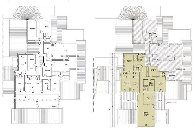 Prima della ristrutturazione, l’ultimo piano dell’edificio era totalmente adibito ad hotel, con 11 camere e un’ampia terrazza. La trasformazione di circa metà del piano in abitazione privata (il resto rimane alberghiero), ha previsto l’ampliamento della superficie esistente tramite la collocazione, sulla terrazza, di un modulo eco-sostenibile in legno collegato all’edificio. In questo modulo è stata realizzata un’ampia area living, servita da un bagno ricavato da una ex camera dell’hotel. Il resto dell’abitazione (tre camere da letto, un bagno ospiti e locali di servizio) è stato ricavato da altre 7 ex camere.