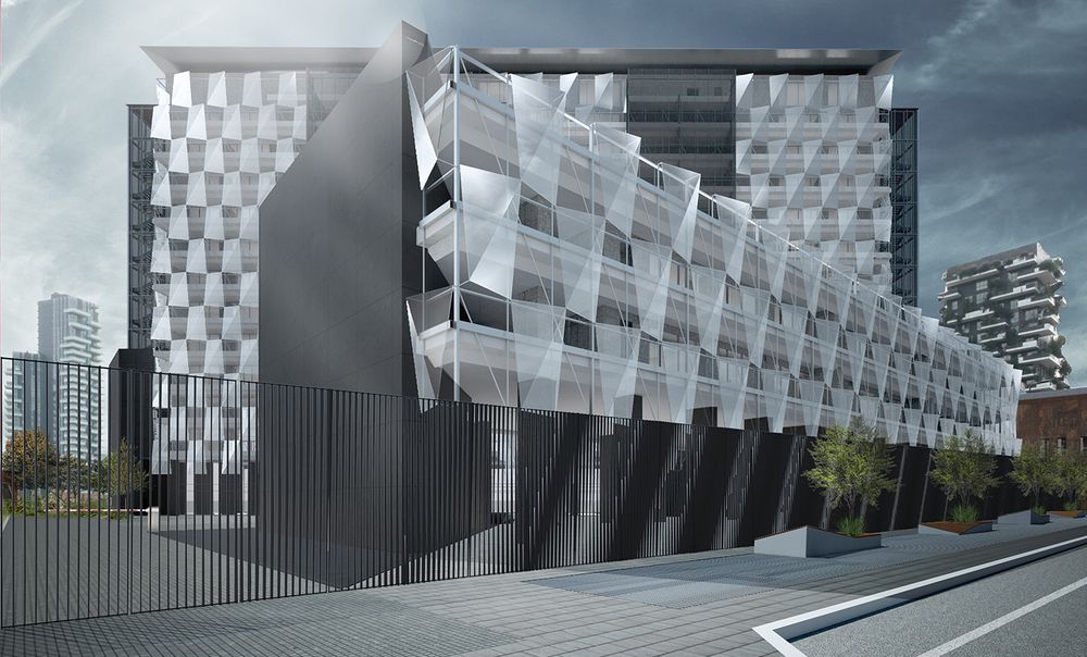 Tratto qualificante del complesso è la facciata, cucita sull’edificio come un prezioso tessuto di vetro che restituisce giochi di luce sempre diversi a seconda del punto da cui la si guarda. Una facciata prismatica, dinamica ed elegante, che dialoga con gli edifici vicini, ben inserendosi nel linguaggio architettonico del distretto.