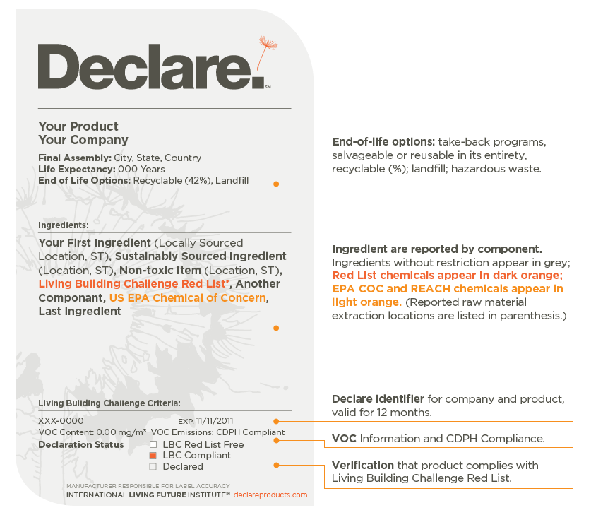 Le etichette Declare soddisfano requisiti come quelli della Red List di Living Building Challenge, la lista Svhc del Regolamento Reach e la Sin List delle sostanze presenti nel prodotto finale. I prodotti privi di questi ingredienti sono evidenziati nell’etichetta Declare e nel database Ilfi dei prodotti Declare.