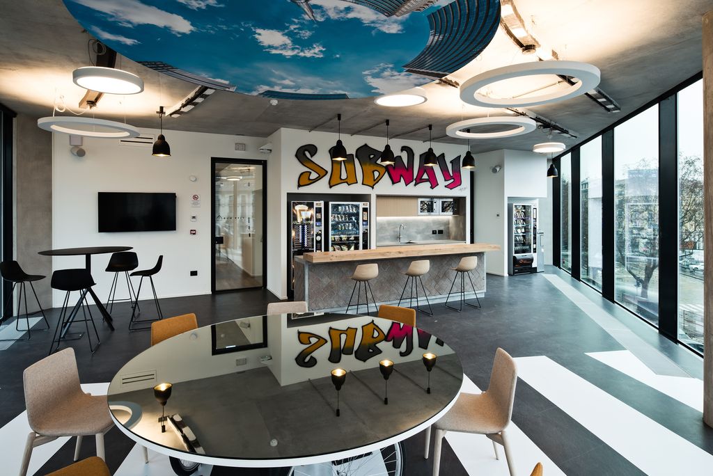 Fondamentali sono i Social hub, spazi informali dedicati ai break, personalizzati negli arredi a tema: sport, città e natura.