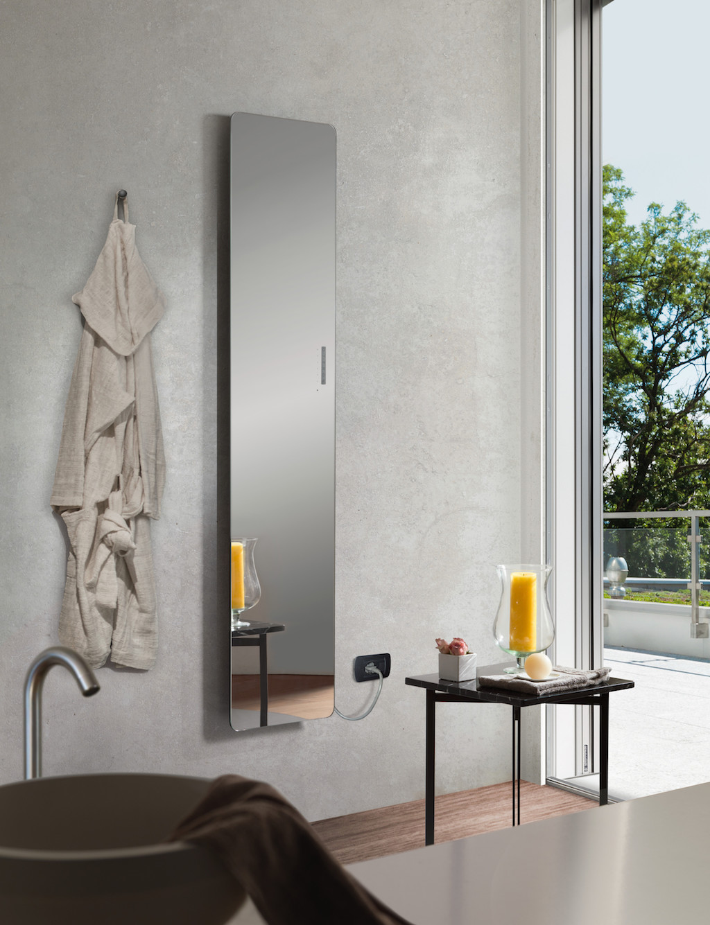 Disponibile in due finiture, rispetta la nuova normativa Ecodesign per la riduzione degli sprechi: oltre al display touch a bordo specchio, è in dotazione un telecomando a infrarossi che consente la programmazione di accensione e spegnimento in modalità cronotermostato per la gestione separata dall’impianto di riscaldamento.
