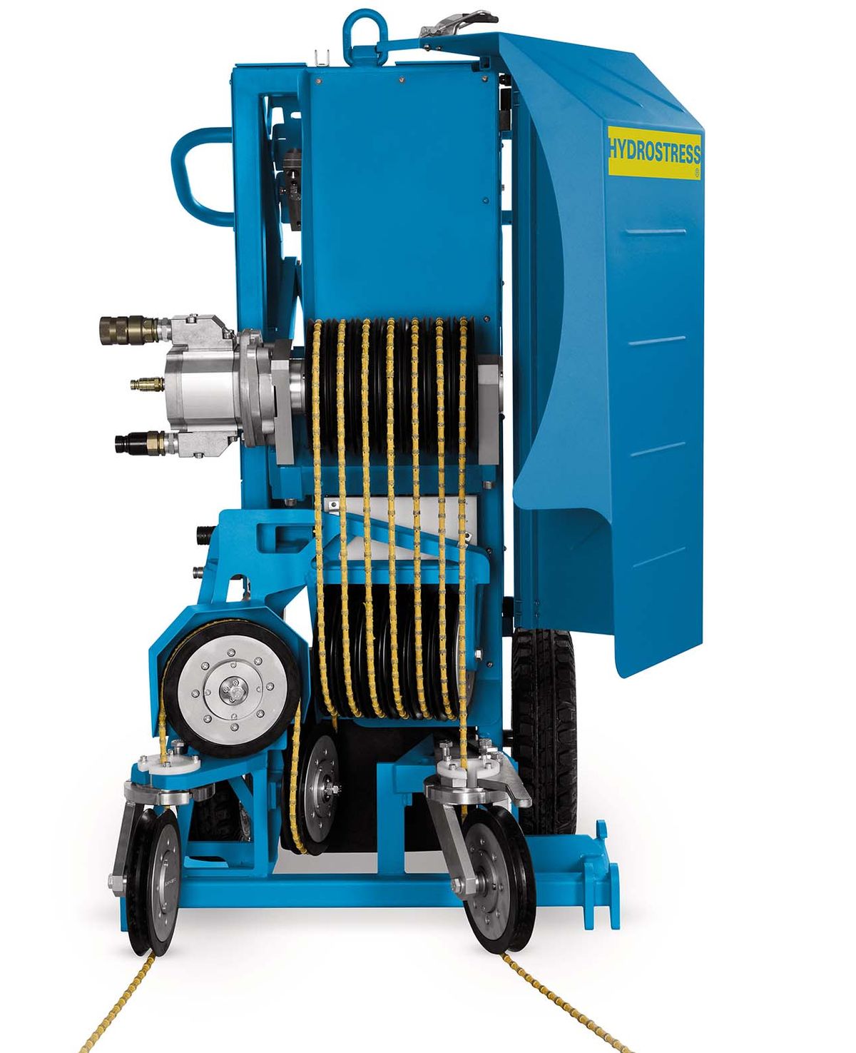 • La sega a filo idraulica Sb Tyrolit Hydrostress è dotatdi un accumulatore del filo largo e compatto e di un’elevata trasmissione di forza, con l’ausilio del sistema di azionamento a pulegge multiple. Le pulegge integrate consentono il rinvio del filo in tutte le direzioni e il tensionatore idraulico garantisce un funzionamento efficiente. Per rendere il lavoro più semplice e flessibile possibile, l’accumulatore del filo può essere riempito senza l’uso di utensili.