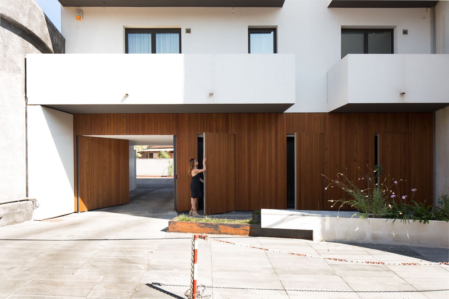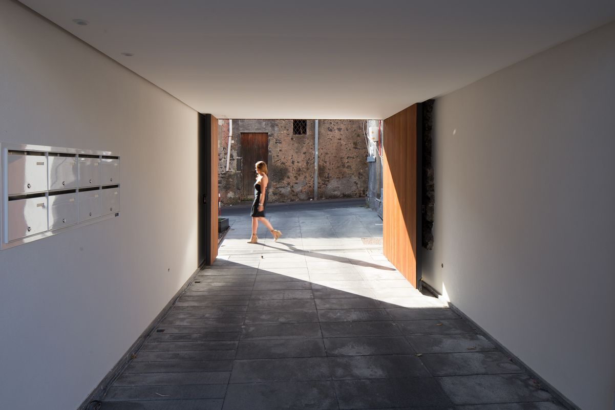 All’aprirsi del cancello carrabile e pedonale, si scorge il preesistente muro e l’arco in pietra lavica e cotto caratterizzante l’edificio demolito e quello della proprietà limitrofa, che diviene il simbolo del luogo; dal passaggio a portico si aprire la vista verso le aiuole, l’area a parcheggio e le aree a verde.