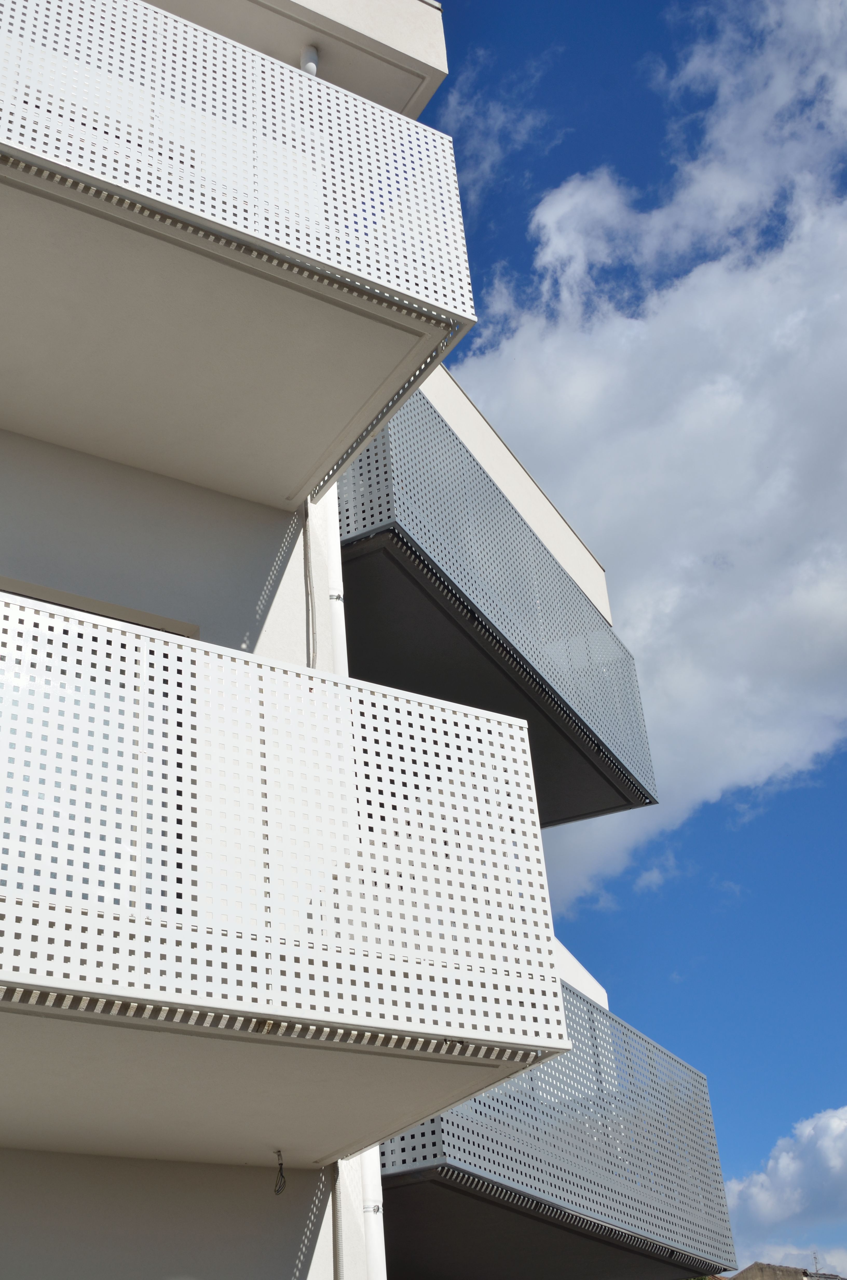 Le balaustre di tutte gli edifici sono state realizzate in parte in muratura e in gran parte in metallo e vetro. Quelle in metallo, sono di due tipi: pannellature di lamiera piena in acciaio zincato verniciato e lamiere zincate forate verniciate.