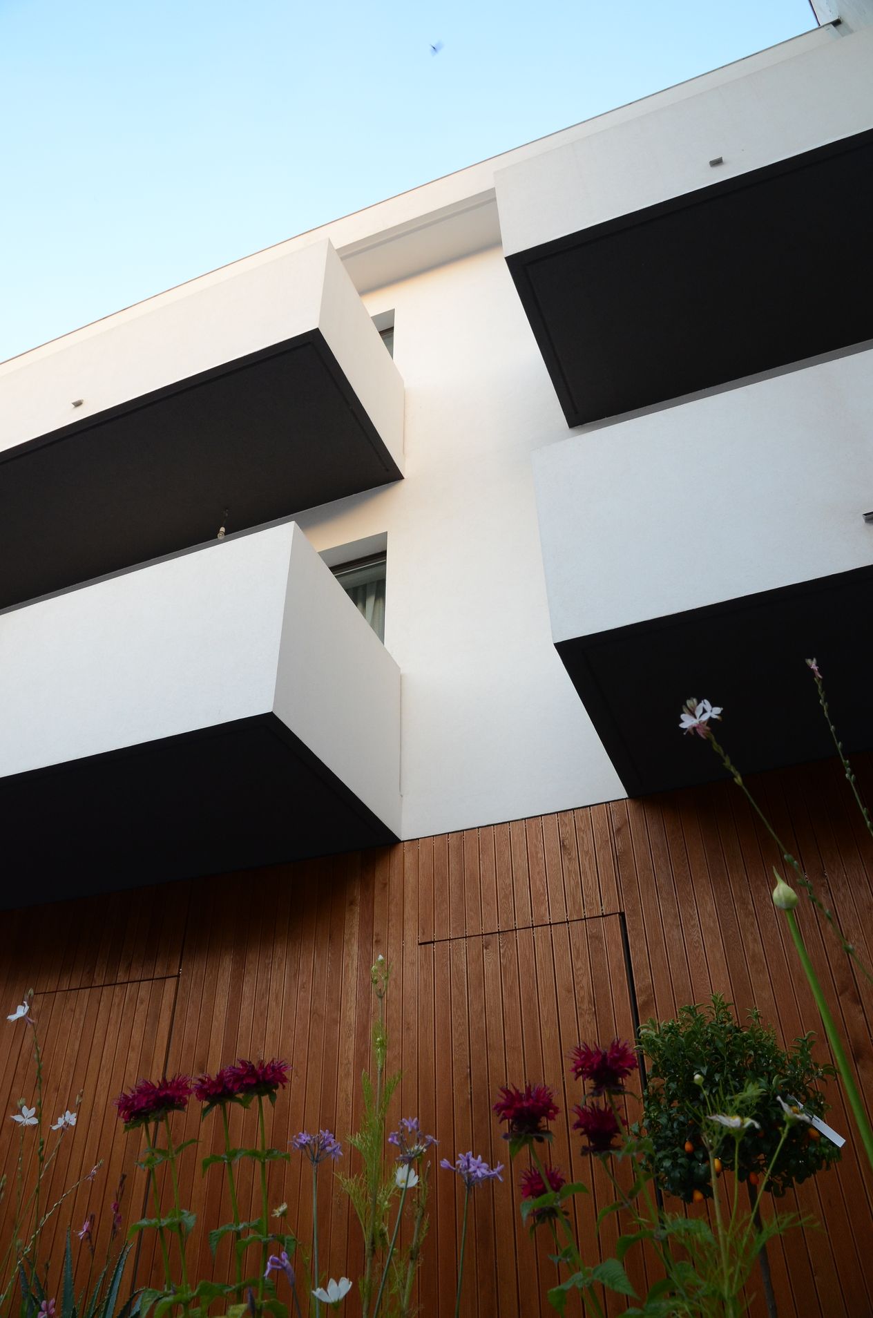 La particolare geometria del lotto ha condizionato l’articolazione volumetrica degli edifici nella zona comune all’aperto del residence, che è caratterizzata da articolati piani di facciata e da balconi sfalsati dai quali poter ammirare i vari spazi esterni, distinti in aiuole con piante erbacee, aiuole con arbusti, parti pavimentate in pietra lavica bocciardata e passerelle in legno decking per l’accesso ai cortili privati. Altra zona comune è quella a parcheggio adibito ai residenti.