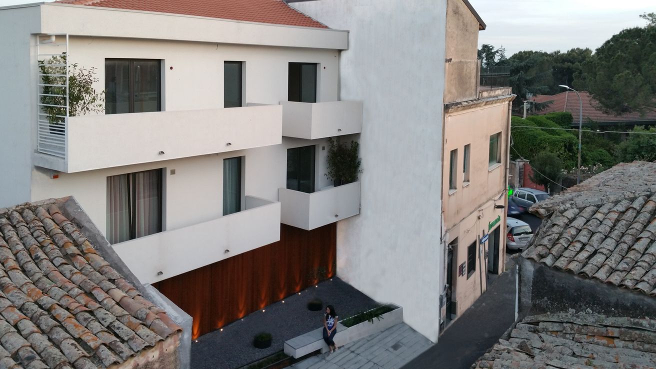 L’intervento è consistito nella demolizione degli edifici esistenti per dare sedime a due edifici il cui inserimento urbanistico segue l’allineamento della preesistenza su via Etnea e all’assegno di linea definito dalle preesistenze o all’arretramento di 10 metri altrimenti imposto dal regolamento edilizio e dal codice civile in merito alle distanze tra gli edifici, si è preferito quest’ultimo lungo la via secondaria via Mascagni. Ciò ha consentito di creare uno spazio filtro tra pubblico e privato, in parte lastricato con pietra lavica bocciardata e in parte a pietrisco lavico e verde, il tutto arricchito da una panca appositamente disegnata e da un sistema di alloggio bici per gli abitanti del residence.